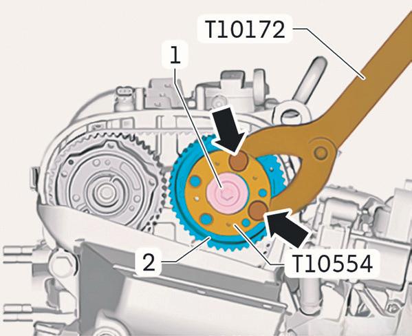 Com a correia dentada devidamente instalada, é hora de apertar os parafusos das polias dos comandos de válvulas. É fundamental lembrar que cada uma dessas polias deverá ser imobilizada pela ferramenta T10172/2-9 em conjunto com a T10554. E, ainda, conforme recomendado anteriormente, esses parafusos deverão ser novos, pois agora passarão por três fases de torqueamento, como segue: