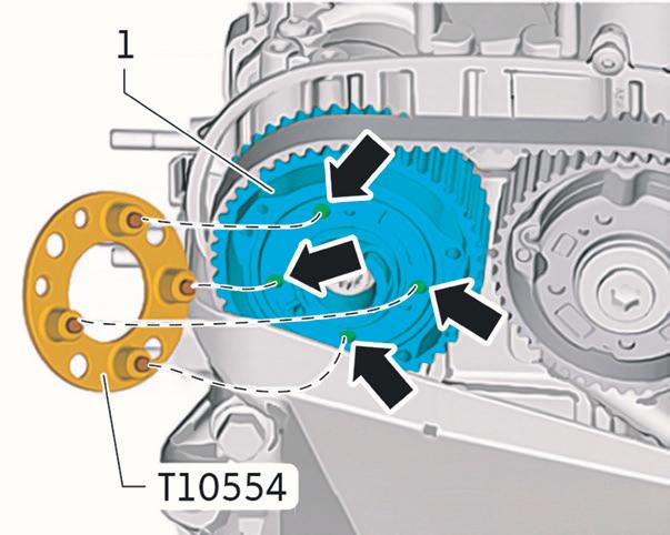 Soltura das polias variadoras dos comandos de admissão e escape – Seja na instalação de uma correia dentada usada ou de uma nova, os parafusos das polias variadoras dos comandos de válvulas de admissão e escape deverão ser soltos. A ideia é deixar as polias girando livremente durante a instalação da correia dentada, o que irá permitir que a correia se desloque sem tirar nenhuma das árvores do sincronismo de suas posições. Soltura da polia do comando de admissão – Remova o bujão de fechamento do variador da polia. Em seguida, imobilize a polia utilizando a alavanca de imobilização T10172/29 juntamente com o adaptador para fixação da alavanca às polias T10554. Por fim, solte o parafuso de fixação dessa polia ao eixo de comando de válvulas de admissão. É imprescindível que, para a soltura desse parafuso, seja feita a imobilização com as duas ferramentas citadas. A T10554 se encaixa na polia de modo a permitir que se exerça força nessa polia em pontos que não provoquem sua quebra. Isso é necessário pois as paredes externas tanto da polia do comando de admissão quanto do comando de escape são construídas em aço sinterizado. Com isso, essas peças ficam leves e eficientes para o seu trabalho, porém sensíveis a pressões inadequadas, podendo ocorrer uma quebra em caso de procedimentos errados.