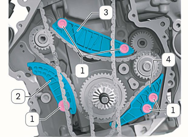 Após a fixação da corrente de acionamento da bomba de óleo, é hora de instalar os dois trilhos-guia restantes: um da corrente de acionamento dos eixos equilibradores e outro de seu tensor . Por sua vez, essa corrente dos eixos equilibradores será finalmente instalada à engrenagem da árvore de manivelas, com o seu terceiro elo escurecido alinhado à marcação existente na engrenagem.