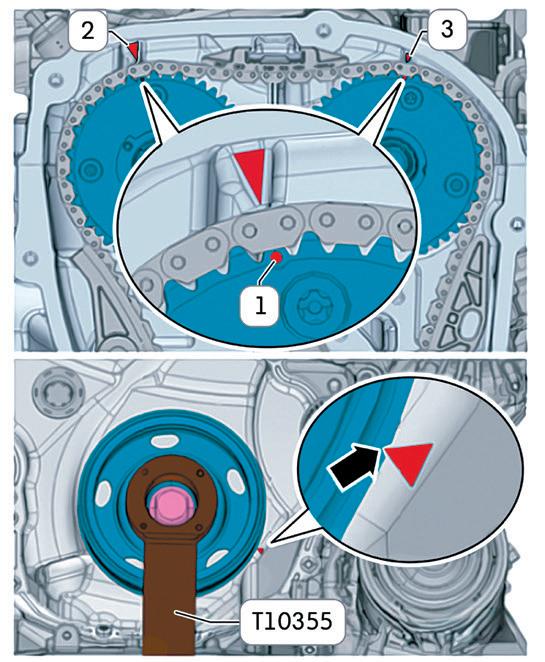 Após a instalação da corrente dos eixos equilibradores, inicie a instalação da corrente de acionamento dos comandos de válvulas. Os eixos dos comandos de válvulas, bem como as suas engrenagens, estão imobilizados pelas travas T40271/ 1 e T40271/2. Com isso, posicione os elos escurecidos da corrente às marcações existentes em cada uma das engrenagens dos comandos variáveis. Agora, instale essa corrente à engrenagem da árvore de manivelas. A terceira marcação dessa corrente, ou seja, o terceiro elo escureci-