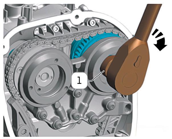Gire o conjunto por meio da engrenagem de fixação da corrente até que as duas marcações da engrenagem intermediária se alinhem com a marcação da engrenagem do eixo equilibrador, conforme as marcações indicadas pela seta na figura. O parafuso de fixação das engrenagens (1) nunca deverá ser removido.
