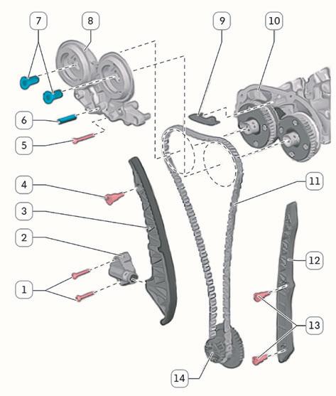 • 2 – Tensor da corrente; 3 – Trilho-guia direito; 7 – Válvulas dos variadores dos comandos; 8 – Ponte do mancal principal dos comandos; 9 – Trilho-guia superior; 12 – Trilho-guia direito ; 14 - Engrenagem de acionamento de corrente em três vias.