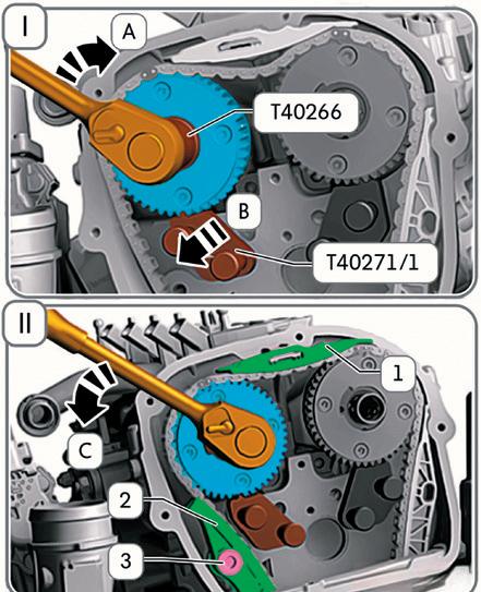 I – Utilizando a catraca e o adaptador T40266, gire a engrenagem do comando de admissão no sentido anti-horário. Ainda mantendo a engrenagem sob a força exercida na catraca, movimente a ferramenta de trava T40271/2 para fora até que a engrenagem esteja liberada.