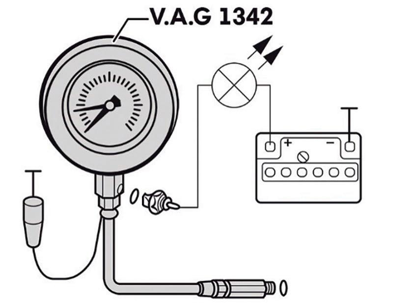 Remova o interruptor da pressão F1 e instale no seu local o manômetro VAG 1342. Instale o F1 no furo disponível no manômetro e repita a conexão da lâmpada (ou led) ao positivo da bateria, ao interruptor F1, e conecte o cabo negativo do manômetro à massa do motor. Durante os procedimentos de verificação, o comportamento da lâmpada deverá ser: