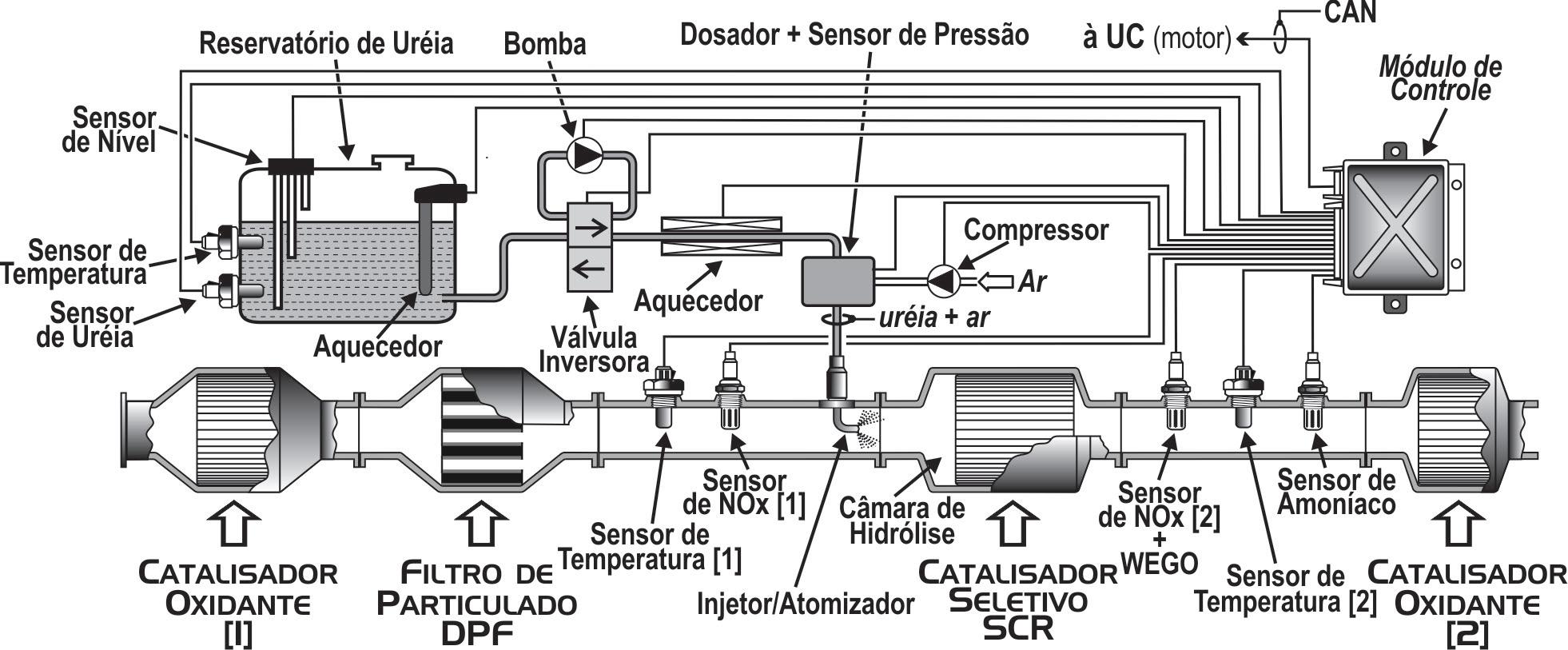 . Controle com sensor de amônia. Neste caso, o controle é direto, medindo a concentração de amoníaco residual através do sensor de NH3, o que permite o controle preciso da dosagem de ureia em praticamente todas as condições de funcionamento do motor.