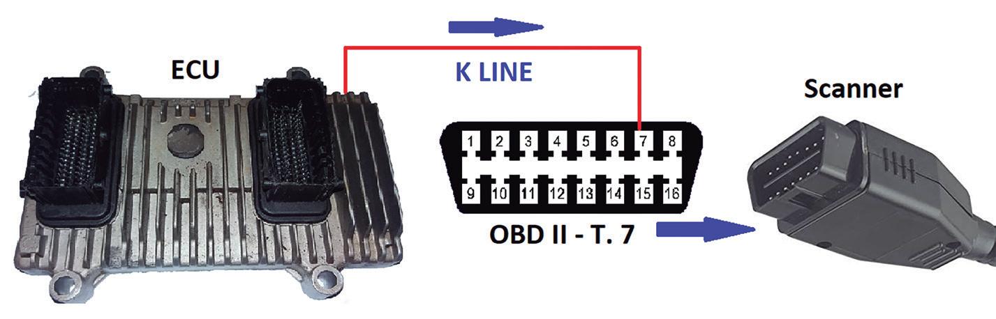 A comunicação K line, embora mais limitada do que o sistema CAN, ainda é utilizada em vários veículos para a comunicação com scanner de diagnóstico. Essa finalidade combina bem com as características de K line, que trabalha com princípio Master / Slave, no qual uma unidade eletrônica trabalha como “mestre”, fornecendo informações que coletou de uma comunicação entre módulos, e enviando essas informações para uma unidade “escrava” que recebe os dados que solicitou, apenas quando houver essa solicitação. Como exemplo, pode-se considerar a comunicação entre um Módulo do motor (Mestre) e um scanner de diagnóstico (escravo). (Fig.2)