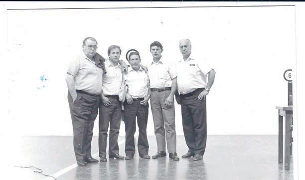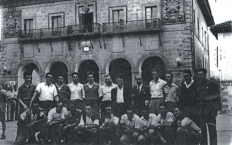 Iturrioztarrak Olentzero eguneko txapelketan, Kontzejupean. Ezkerretik hasita: Justi Zapirain, Joxe Gaztelumendi, Antton Mitxelena, Felipe Azpiroz, Kaxka eta Karlos Mari Azurmendi. (Frontisean, Francoren argazkia ederki ikusten da).