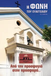 36 | Η ΦΩΝΗ ΤΟΥ ΕΥΑΓΓΕΛΙΟΥ ΗΔεύτερη Ελληνική Ευαγγελική Εκκλησία ιδρύθηκε το 1924 από πρόσφυγες, καταγόμενους από τη Σμύρνη της Μικράς Ασίας και την περιοχή της, καθώς και από την Καππαδοκία. Επίσης, μερικοί προέρχονταν από τη Σαμψούντα και άλλοι από την Κωνσταντινούπολη Οι πρόσφυγες, ερχόμενοι στην ελεύθερη Ελλάδα, έβαλαν ως κύριο σκοπό της ζωής τους όχι να πλουτίσουν ή να αποκτήσουν άνεση, αλλά να φτιάξουν μια εκκλησία για τη λατρεία του Τριαδικού Θεού. Έτσι, αγόρασαν οικόπεδο και έχτισαν εκκλησία, που βρίσκεται πάντα στο ίδιο μέρος (στο Κουκάκι) και η εκκλησία λειτουργεί στο ίδιο κτήριο Το πρεσβυτέριο της Εκκλησίας αποφάσισε να εορτάσει τον πρώτο αιώνα λειτουργίας της εκκλησίας με διάφορες εκδηλώσεις κατά τη διάρκεια του έτους. Η πρώτη εκδήλωση έγινε τον Ιανουάριο και ήταν πιο «οικογενειακή», αφού απευθυνόταν στο εκκλησίασμα. Στην εκδήλωση αυτή μίλησαν μέλη της Εκκλησίας, παλαιά και νέα, καθώς και αδελφοί που βρίσκονται στο εξωτερικό Επίσης προβλήθηκαν δύο βίντεο, το ένα εξιστορούσε την ίδρυση αλλά και τη ζωή της Εκκλησίας και το δεύτερο αφορούσε τις φιλανθρωπικές διακονίες. Η δεύτερη εκδήλωση έγινε σε δύο συνεχόμενες μέρες, το Σαββατοκύριακο 7 και 8 Απριλίου Το Σάββατο ήταν η εκδήλωση για τις εκκλησιαστικές, πολιτικές, δημοτικές αρχές Η εκδήλωση άρχισε με προσευχή του ποιμένα και με το «Πάτερ Ημών», την προσευχή του Κυρίου Εκ μέρους του Αρχιεπισκόπου Αθηνών και πάσης Ελλάδος κου Ιερωνύμου, έφερε χαιρετισμό ο πατήρ Αντώνιος Καλλιγέρης, o οποίος είναι εκπαιδευτικός και συντονιστής της «Πρωτοβουλίας» για την πρόληψη της ενδοοικογενειακής βίας, του Ιδρύματος Νεότητας και Οικογένειας της Ιεράς Αρχιεπισκοπής Αθηνών, τον οποίο και γνωρίζει προσωπικά ο ποιμένας της εκκλησίας Γεώργιος Αδάμ, μέσω δράσεων στις οποίες συμμετείχαν στο παρελθόν. Ο πατήρ Αντώνιος έφερε έναν χαιρετισμό από καρδιάς, πραγματικά εγκάρδιο, όπως έκαναν και όλοι οι ομιλητές, που πιστεύω ότι αισθάνονταν στο σπίτι τους Δεύτερος μίλησε ο Αρχιεπίσκοπος Καθολικών Αθηνών πατήρ Θεόδωρος Κοντίδης Με τον πατέρα Θεόδωρο μας συνδέουν παλιοί δεσμοί φιλίας και συνεργασίας. Έτσι, η παρουσία και ο λόγος του ήταν εκείνος ενός καλού φίλου. Τρίτος μίλησε ο Πρόεδρος της Γενικής Συνόδου της Ελληνικής Ευαγγελικής Εκκλησίας αιδ δρ Παναγιώτης Κανταρτζής Ο ποιμένας Γιώτης Κανταρτζής μιλούσε μέσα στο «σπίτι» του, οπότε αντιλαμβανόμαστε την αγάπη και τη ζεστασιά του λόγου του. Στη συνέχεια μίλησε ο Βουλευτής Καρδίτσας κύριος Κώστας Τσιάρας. Ο βουλευτής, πρώην υπουργός και τώρα Κοινοβουλευτικός Εκπρόσωπος του κυβερνώντος κόμματος, φρόντισε ο ίδιος, προκειμένου να τιμήσει στον μεγαλύτερο βαθμό την εκδήλωση, να οριστεί εκπρόσωπος σε αυτήν, του Προέδρου της Βουλής κυρίου ΚωνσταντίΑπό τoν ΓΙΑΝΝΗ ΤΣΕΒΑ