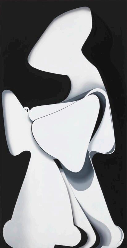 Line is emphatically edge in Hagerty’s work. The forms in her paintings are brought into being in her studio through and in relation to drawing and collage. Collage as a practice is especially important: her painted edges are often developed along with cut forms and the memory of cut materials and their keen edges haunts the surfaces of her paintings. It is as if the paintings have a double materiality: as if the lines in her work are double edged. Her brush doubles the work of a cutting tool. It is often the illusion of three-dimensionality that is carried by this doubling: the edges often define what appear to be stacked forms or planes. While the broad planes of her forms tend to emphasise the picture plane, the surface of the canvas itself recapitulated, her line as edge virtually cuts that plane to excavate depth. Hagerty’s beguiling edges have a decisive sharpness, and a kind of hardness, while as often curved lines they define what appear to be soft forms. This play of opposites makes them doubly seductive.