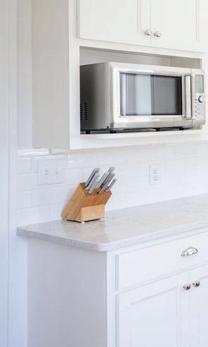 Extending the cabinet height as high as we could go and plotting out the workflow and necessary storage allowed us to maximize every inch we could in the space. Functional things like a microwave shelf and a range hood were added, along with features like under-cabinet lighting.