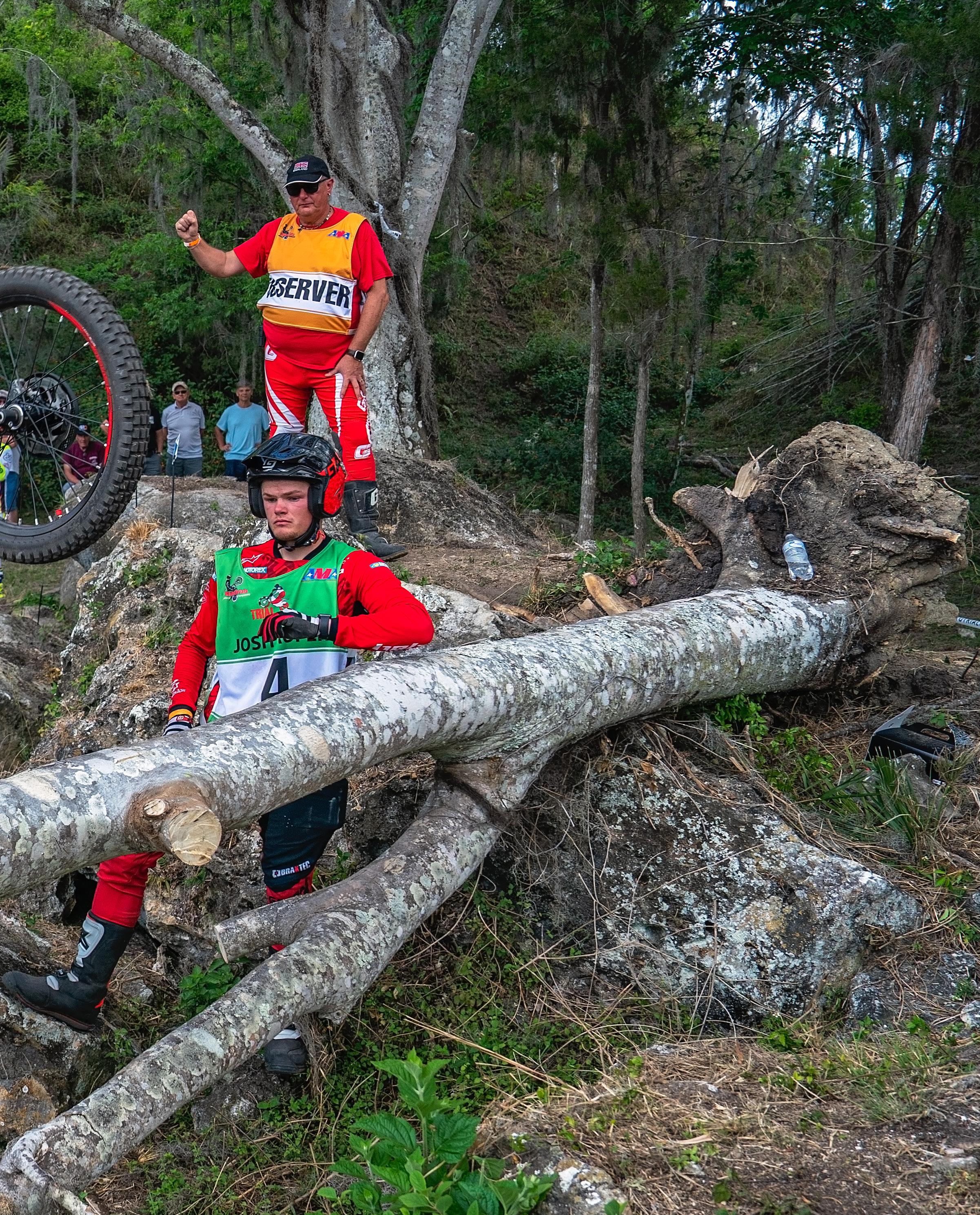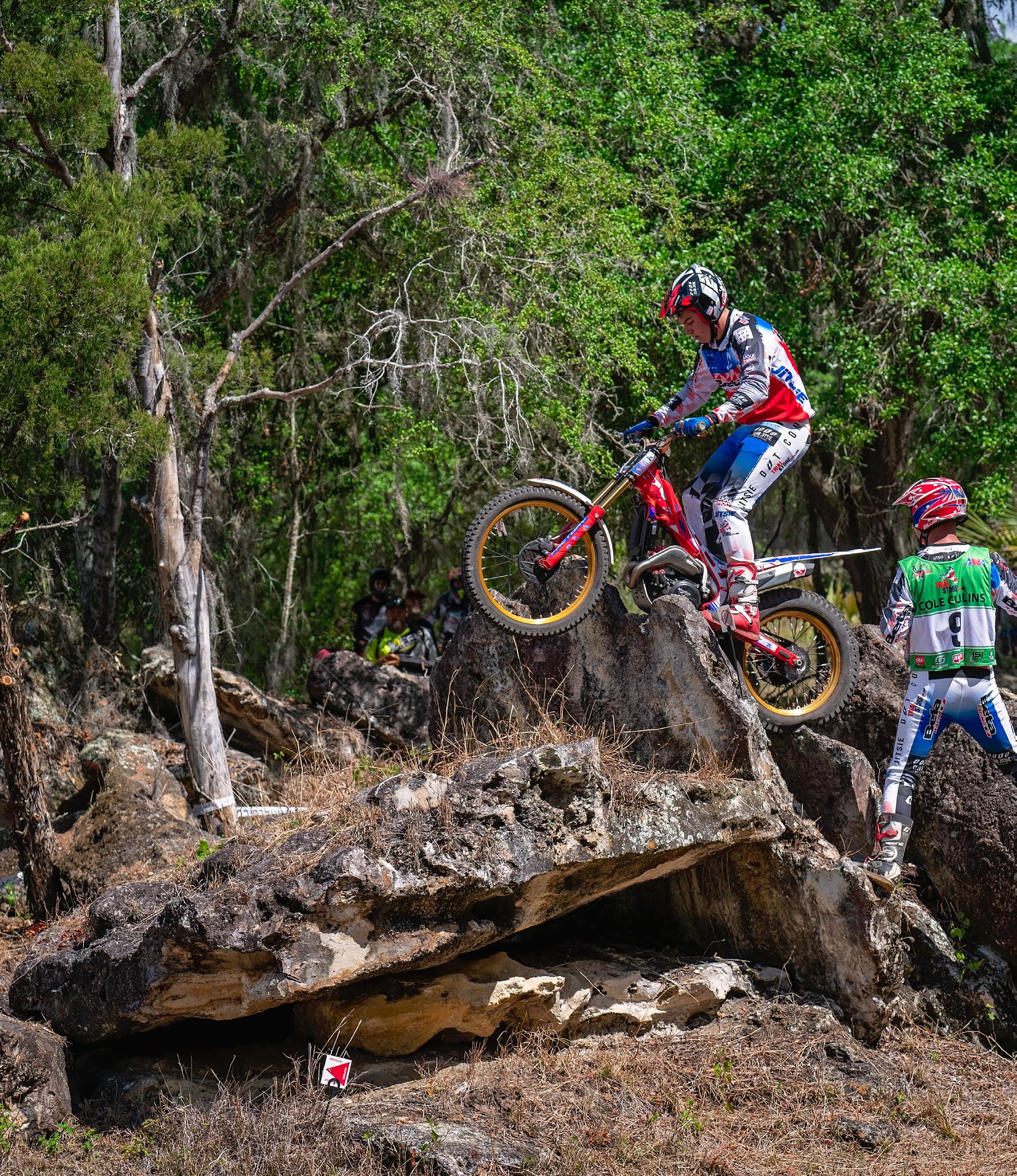 GasGas's Josh Roper takes the top step of the podium in round 1 of the 2023 AMA NATC National Mototrials Championship Series. Pictured here with minder, Nigel Parker.