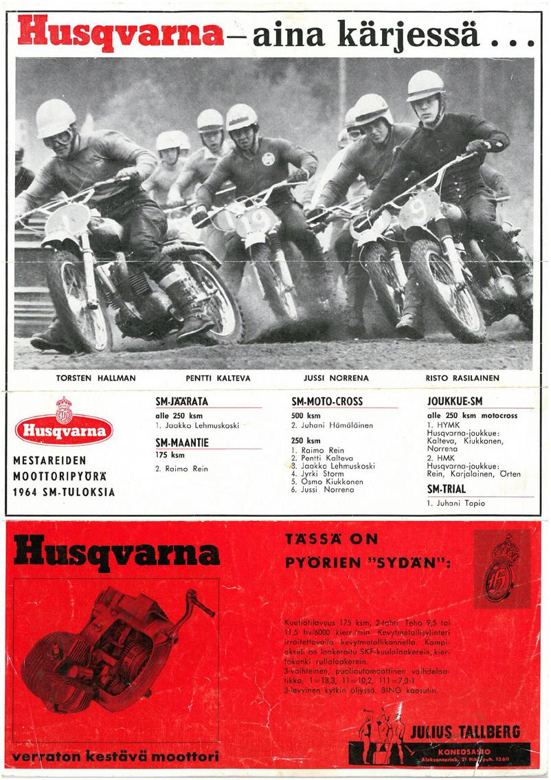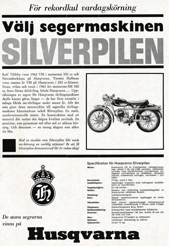 The newcomer was by far the best and most competitive motocross product for sale on the market. As there also were substantial leftovers from the production of the Silver Arrow, sales continued with this unit until 1965, when street machines were abandoned for good. At least, that was the thinking from the management in Huskvarna.