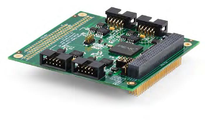 The PCAN-PCI/104-Express card enables the connection of one or two CAN buses to a PCI/104-Express system. Up to four cards can be stacked together. The CAN bus is connected using a 9-pin D-Sub plug on the slot brackets supplied. There is galvanic isolation of up to 500 V between the computer and CAN sides.