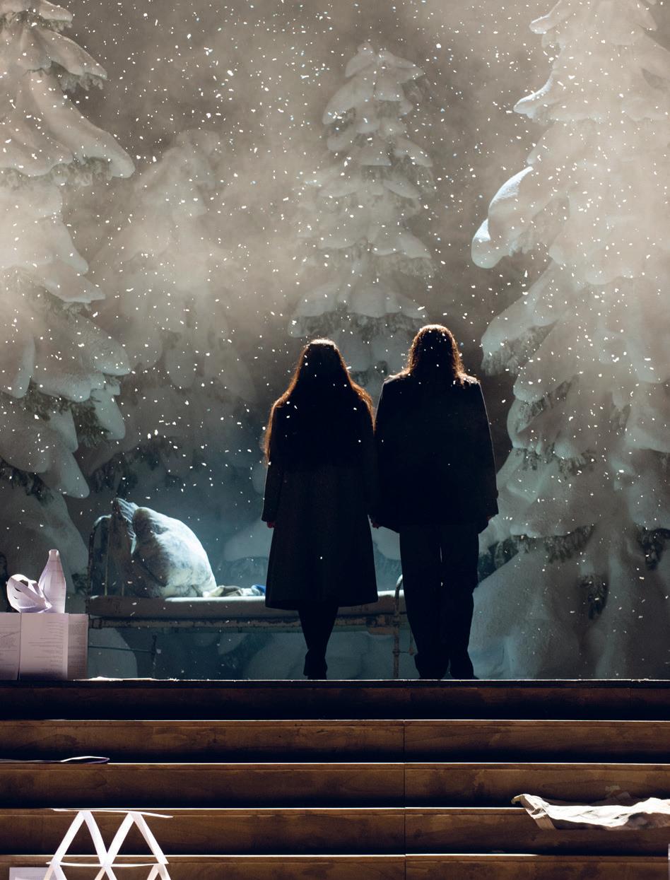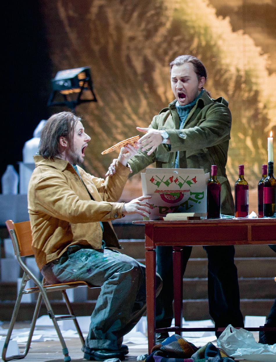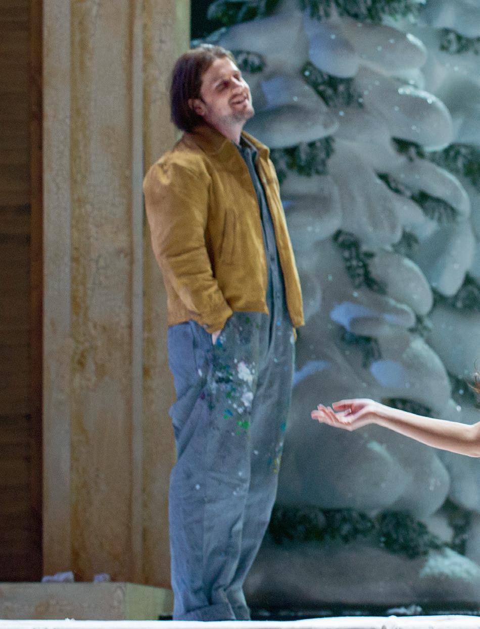 verändert hat. Der Ort der Handlung, ein Zollhäuschen am Pariser Stadtrand, mag etwas seltsam gewählt erscheinen, aber für die Atmosphäre ist er genau richtig; es herrscht eine eisige, unangenehme Kälte. Nach dem grossen Künstlertraum im zweiten Bild herrscht hier wieder das Thema des Scheiterns vor. Musetta und Marcello streiten, Rodolfo ist eifersüchtig und realisiert gleichzeitig, dass Mimì sehr krank ist – und dass er dieser Situation nicht gewachsen ist. Die beiden entscheiden, sich zu trennen. In unserer Inszenie rung ist der ganze Beginn des Bilds mit den Zöllnern, Milchfrauen und Marktfahrern, Teil des Theaterstücks, das Rodolfo und Marcello auf die Bühne des Volkshauses zu bringen versuchen. Aber Rodolfo ist unzufrieden mit dem Ergebnis. Auch seine künstlerischen Ambitionen drohen zu scheitern...