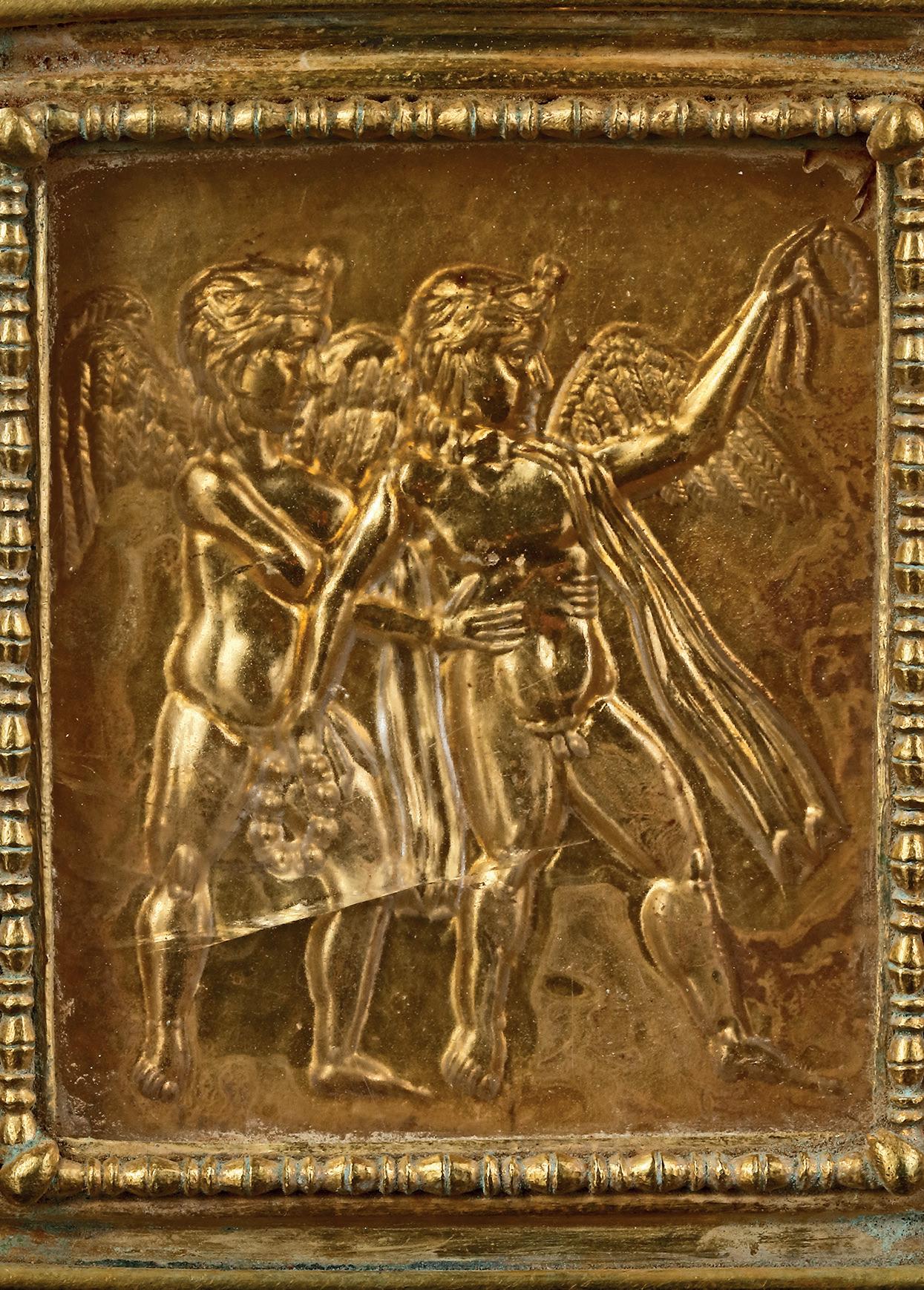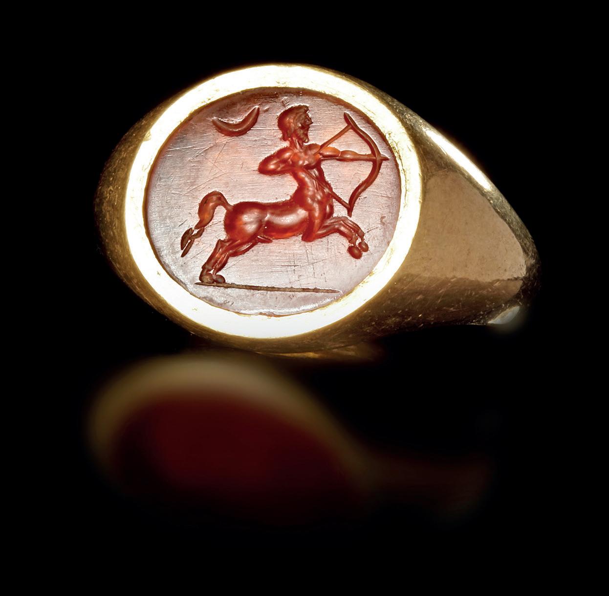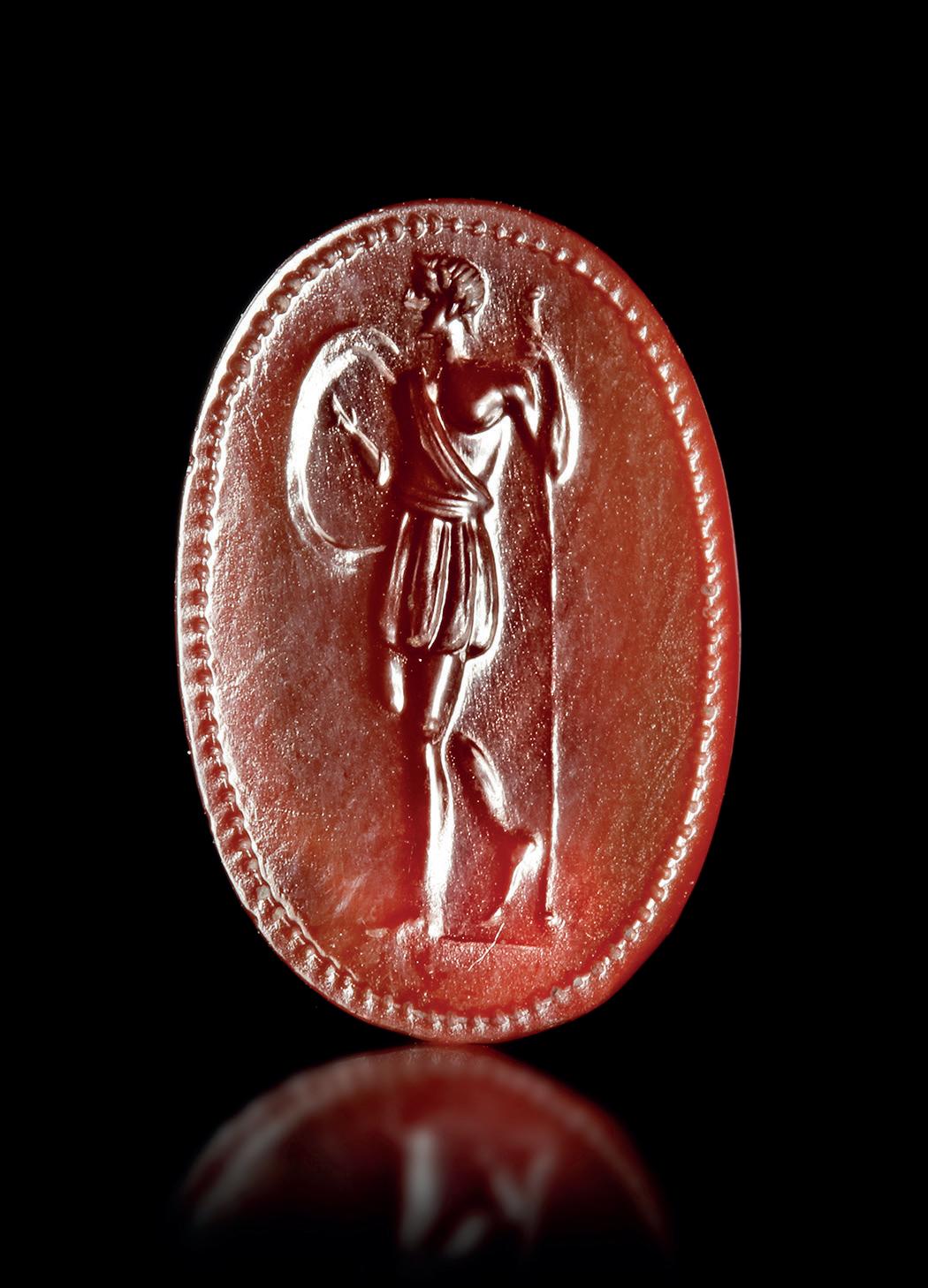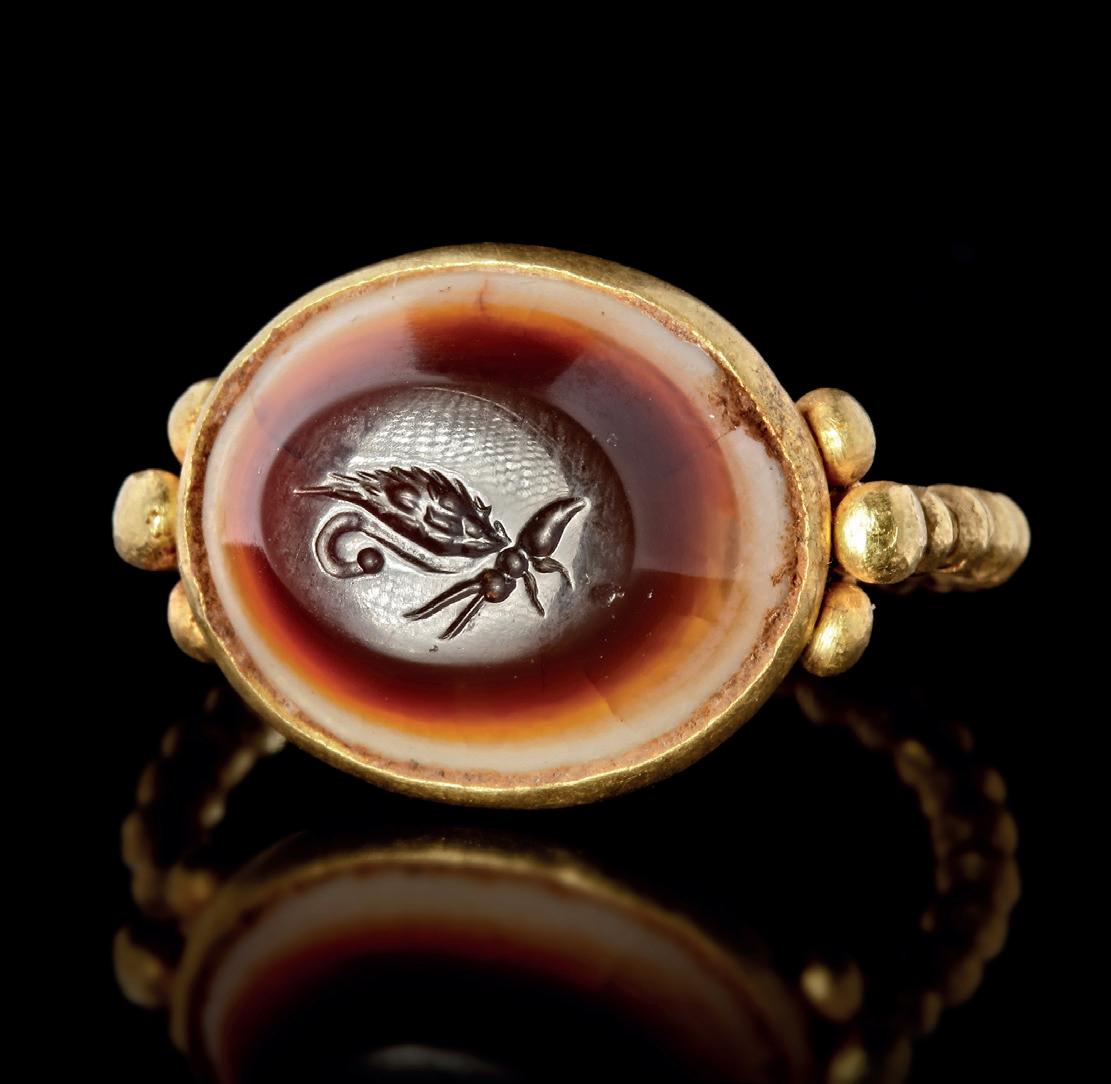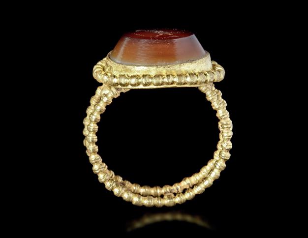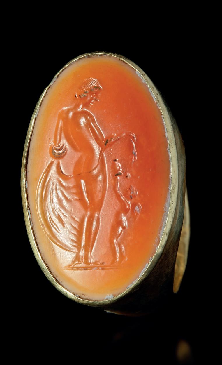 A late Hellenistic hollow gold ring with an orange agate intaglio showing naked Aphrodite/Venus standing with Eros standing facing her and offering a jar of perfumed oil.