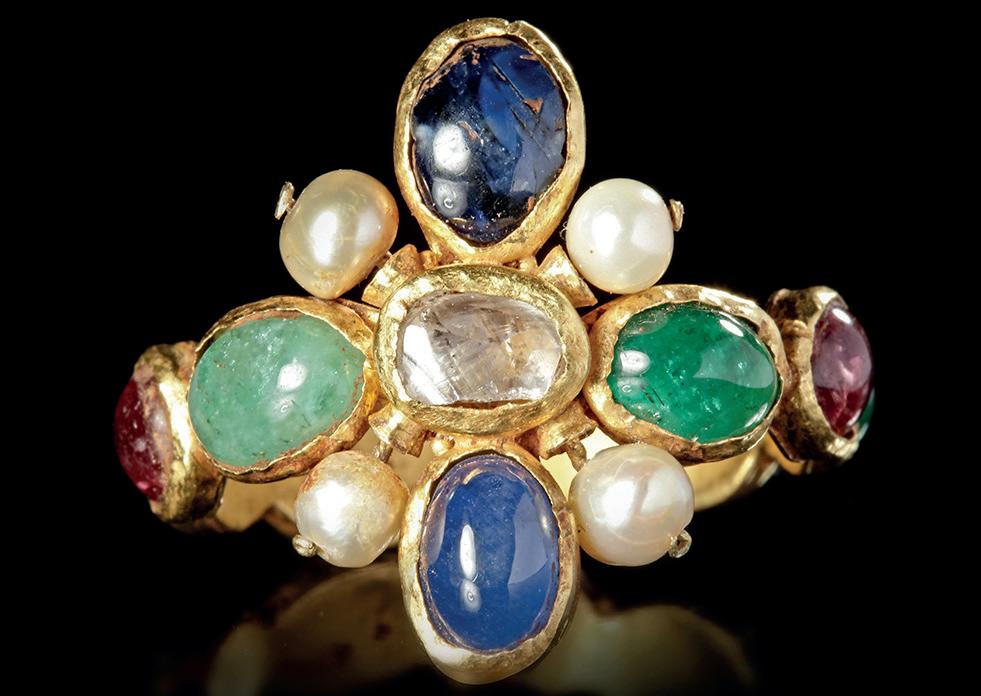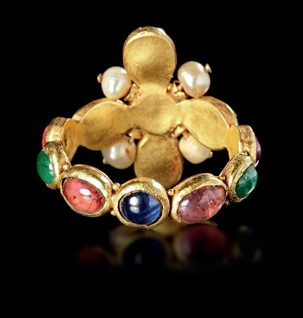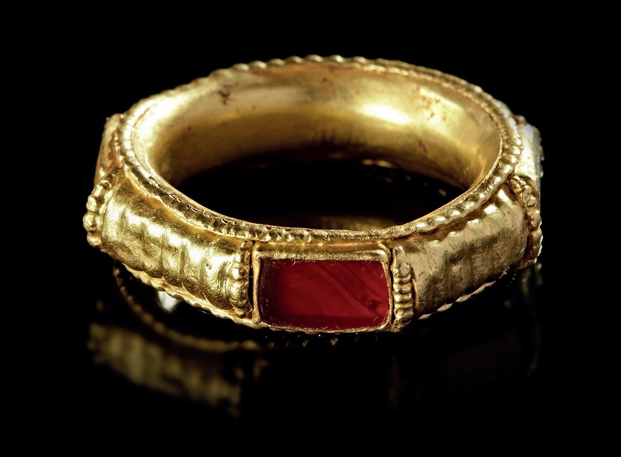 A late Roman gold ring made of repousse sheets and four hard stone inlays. The shank is composed of an inner rounded fold sheet to which is soldered a beaded wire. On to this are then attached four oblong cells which hold the stones; chalcedony, carnelian, peridot and a banded agate. Between the stones are ribbed curved sheet elements. Gold with hard stone inlays.