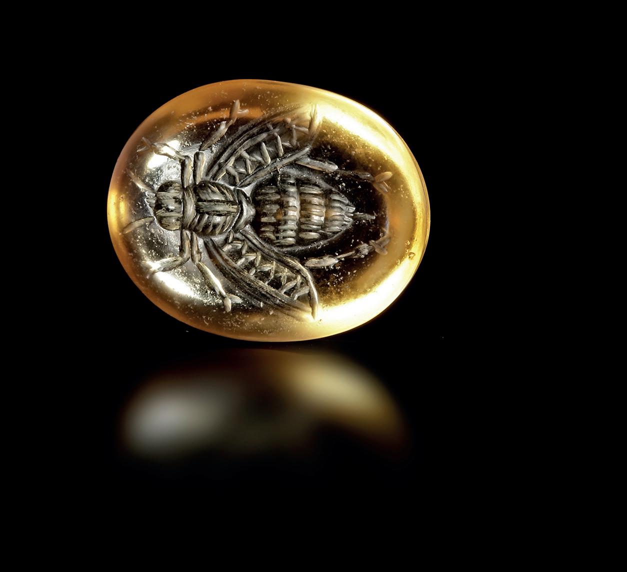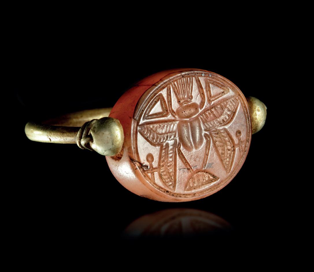 A Phoenician- electrum ring with a carnelian scaraboid engraved with a flying scarab beetle. The head of the beetle is adorned with feathers which seem to combine the image of Bes along with the insect. The use of electrum is also normal during this period.