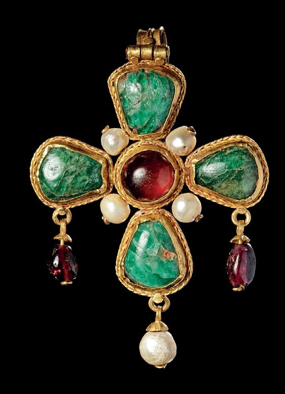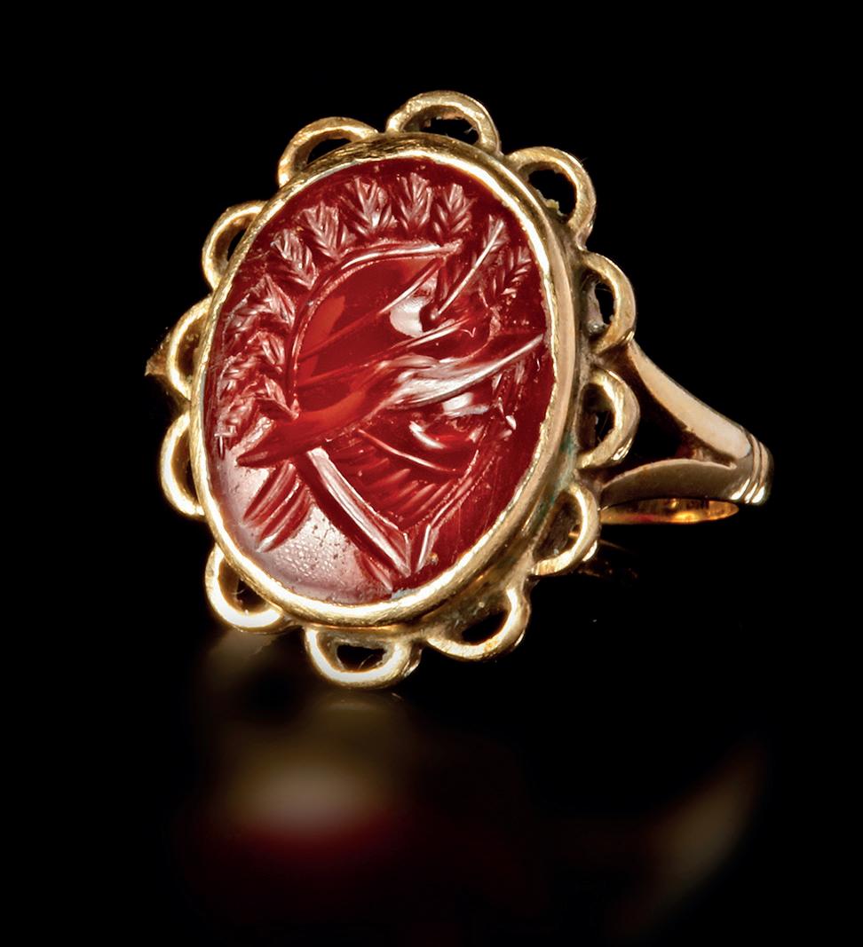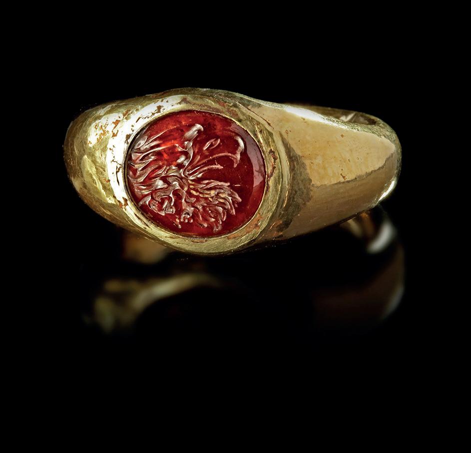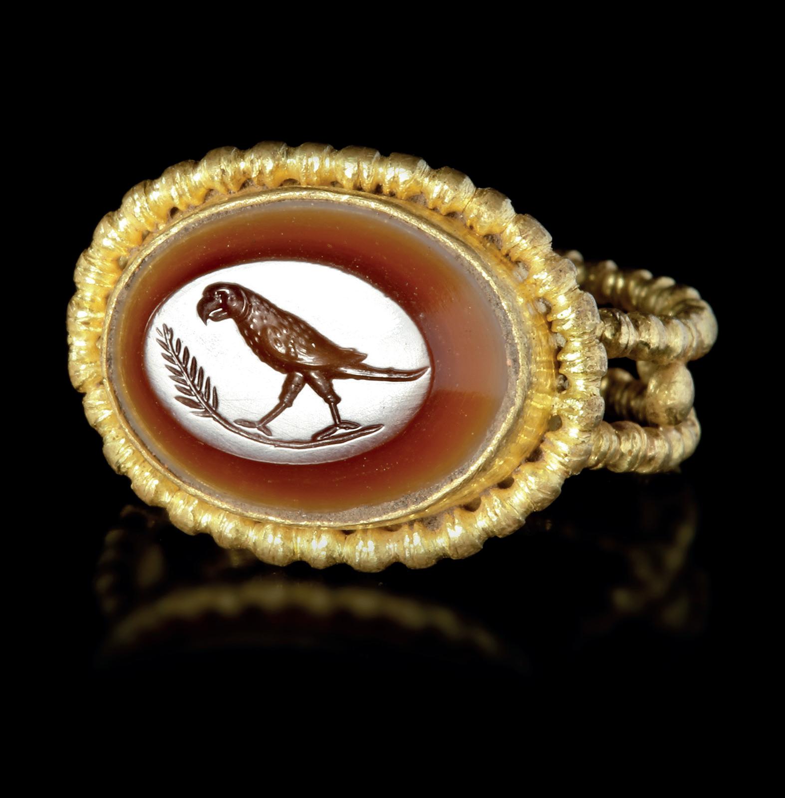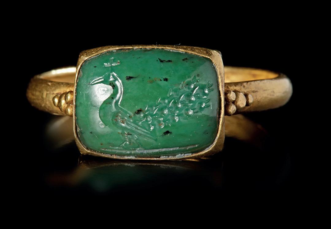 BYZANTINE GOLD RING WITH GREEN BERYL INSET OF A PEACOCK 5TH–7TH CENTURY A.D.