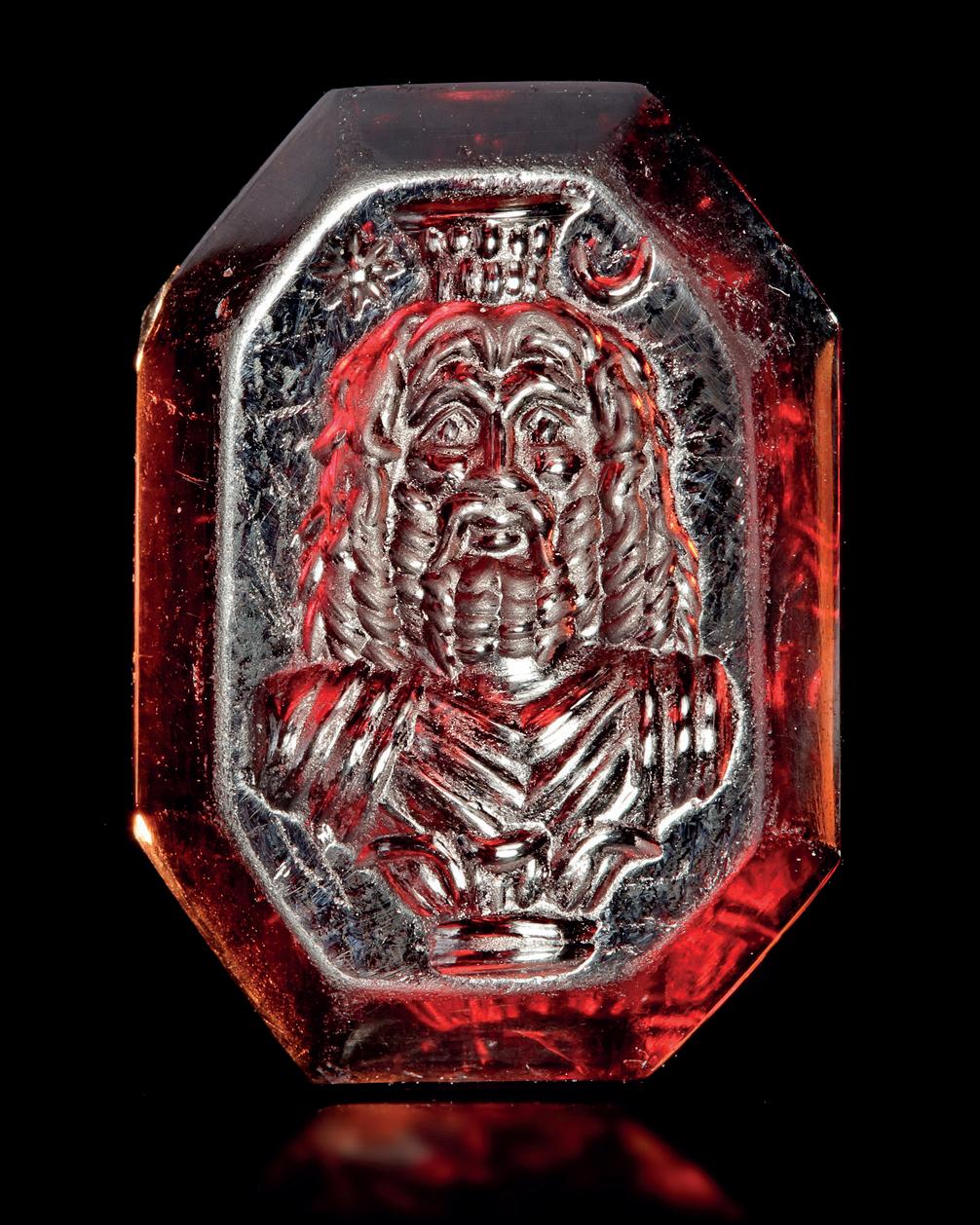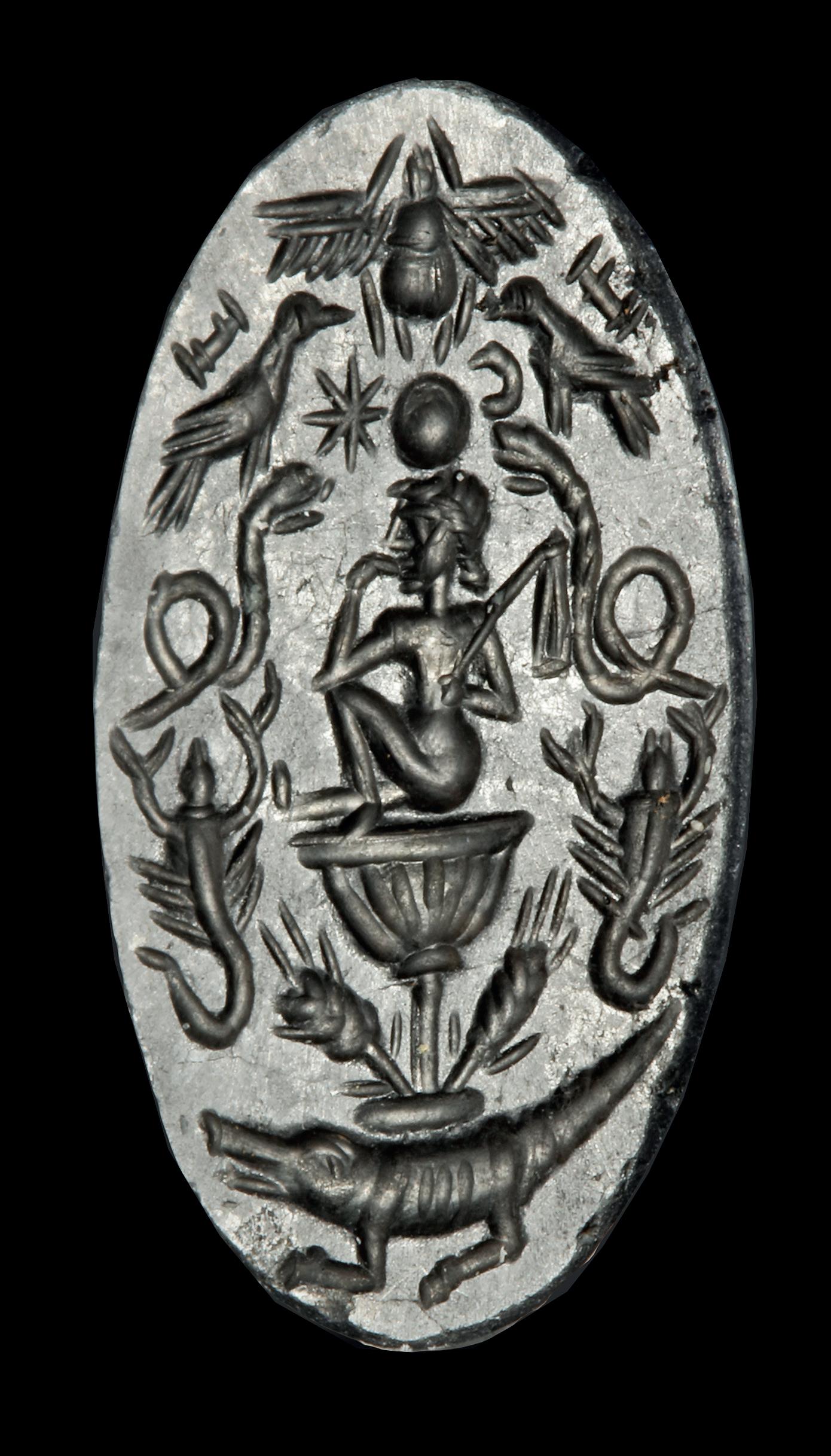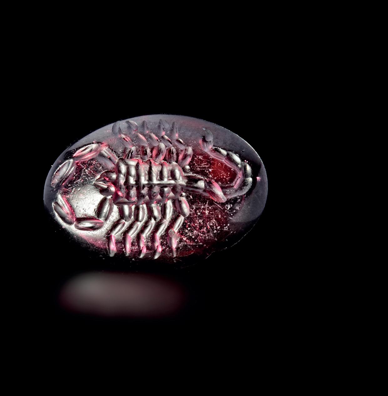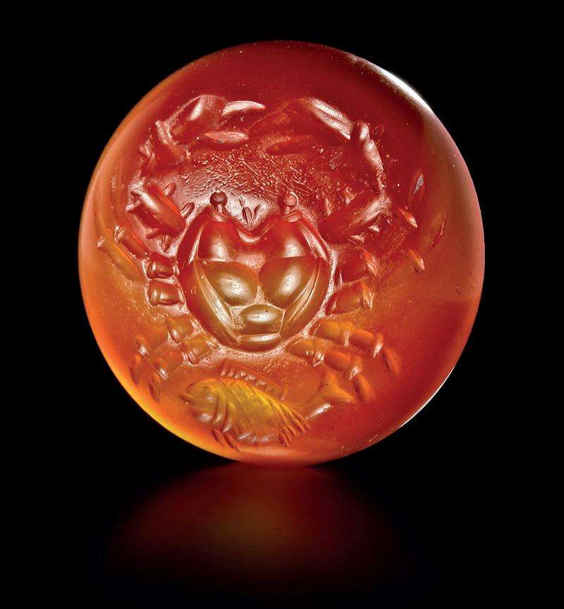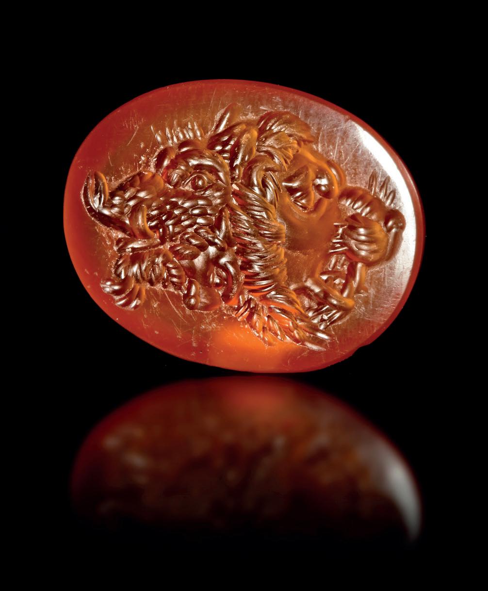 A bead/seal made of a variegated orange jasper showing a lizard with a grasshopper in its mouth. The lizard is often used in gnostic iconography as a symbol for rebirth, the possibility of a Christian connection cannot be ruled out here.