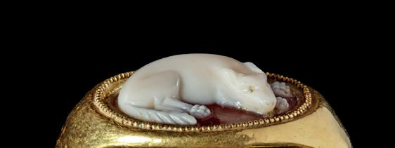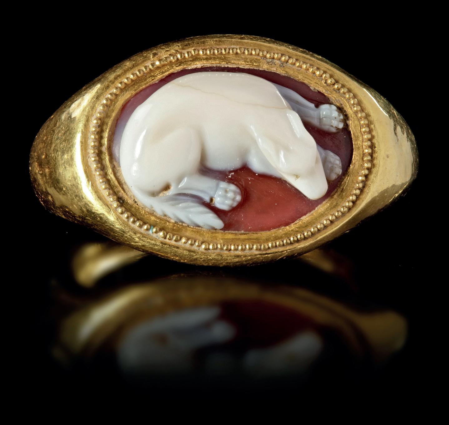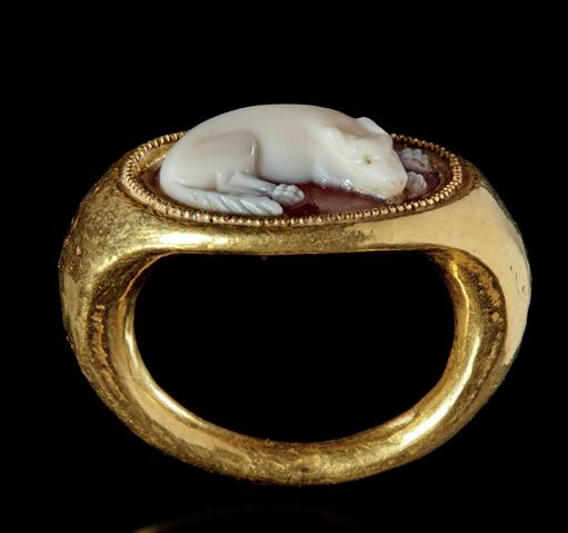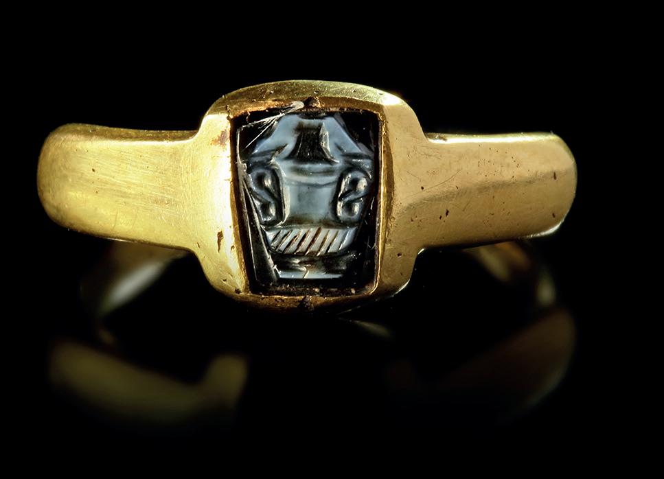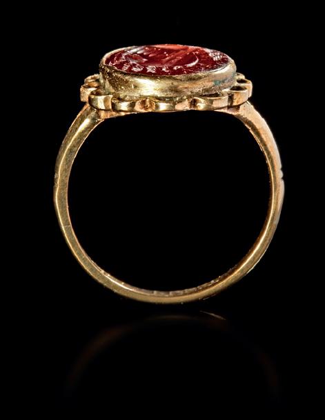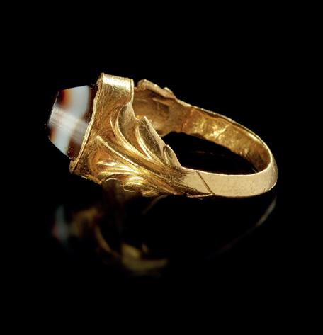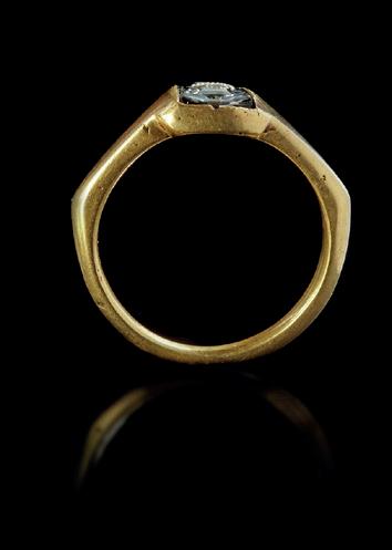 An early Christian ring in gold with a shank made in beaten gold sheet and the bezel made of sheet gold in the shape of an expanding cone. It acts as the setting for a cameo showing a Christogram within a wreath in niccolo or agate.