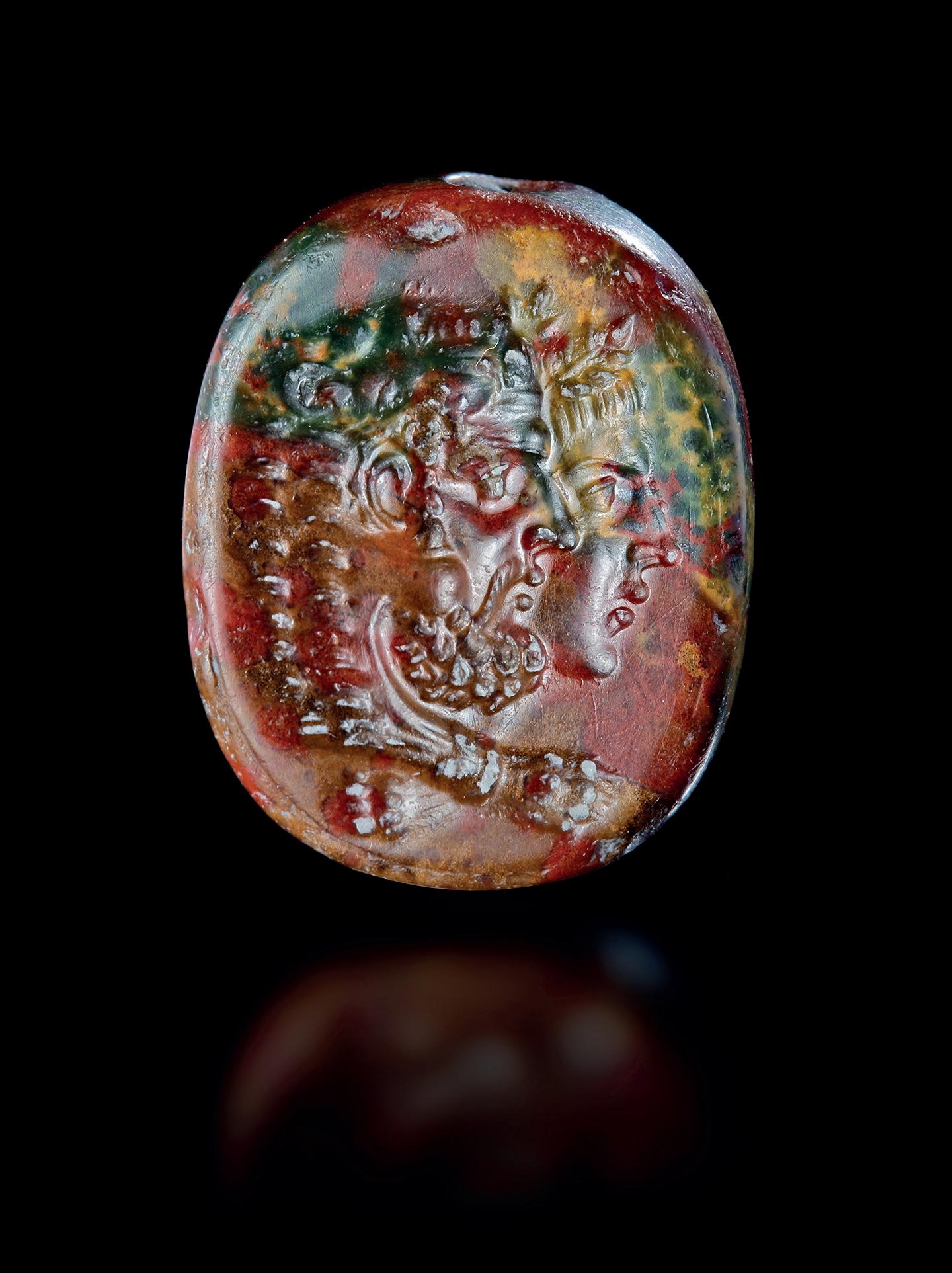 A variegated stone scaraboid with the heads Heracles and Apollo facing right. The gods Heracles and Apollo, while half brothers, were often at odds with each other, therefore their appearance on the seal suggest their connection of the owner to the Macedonian dynasty. This type of stone was popular at the time as attested by the famous scaraboid of Perseus from the Sangiorgi collection. The back is plain save for a central ridge.