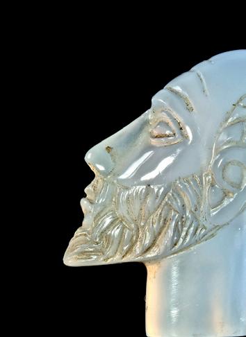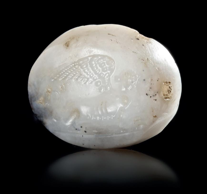 A Greek scaraboid in a white agate like stone with a Sphinx facing left. A very well engraved seal of a Sphinx standing in front of a small altar.