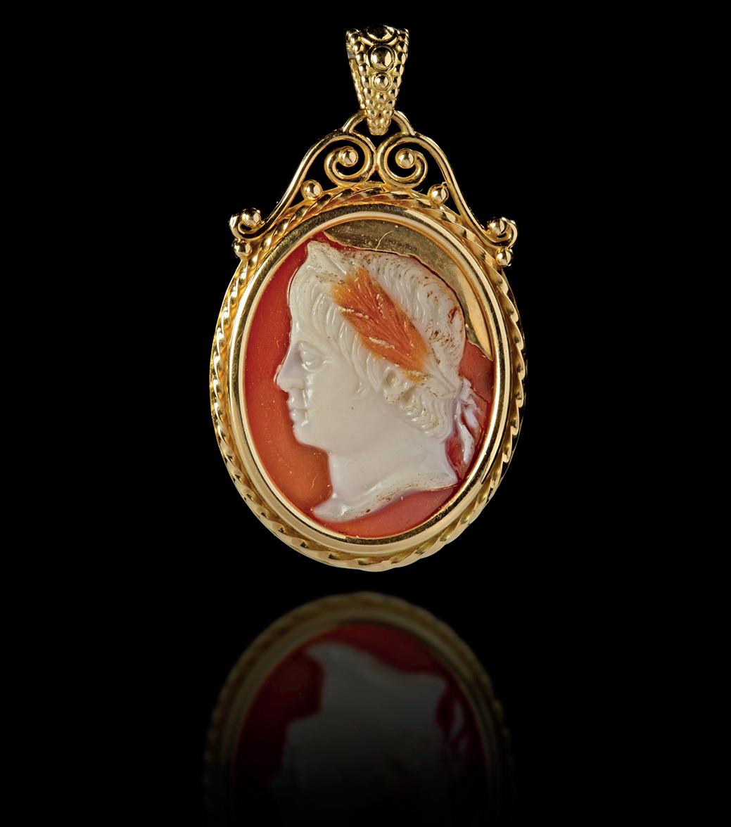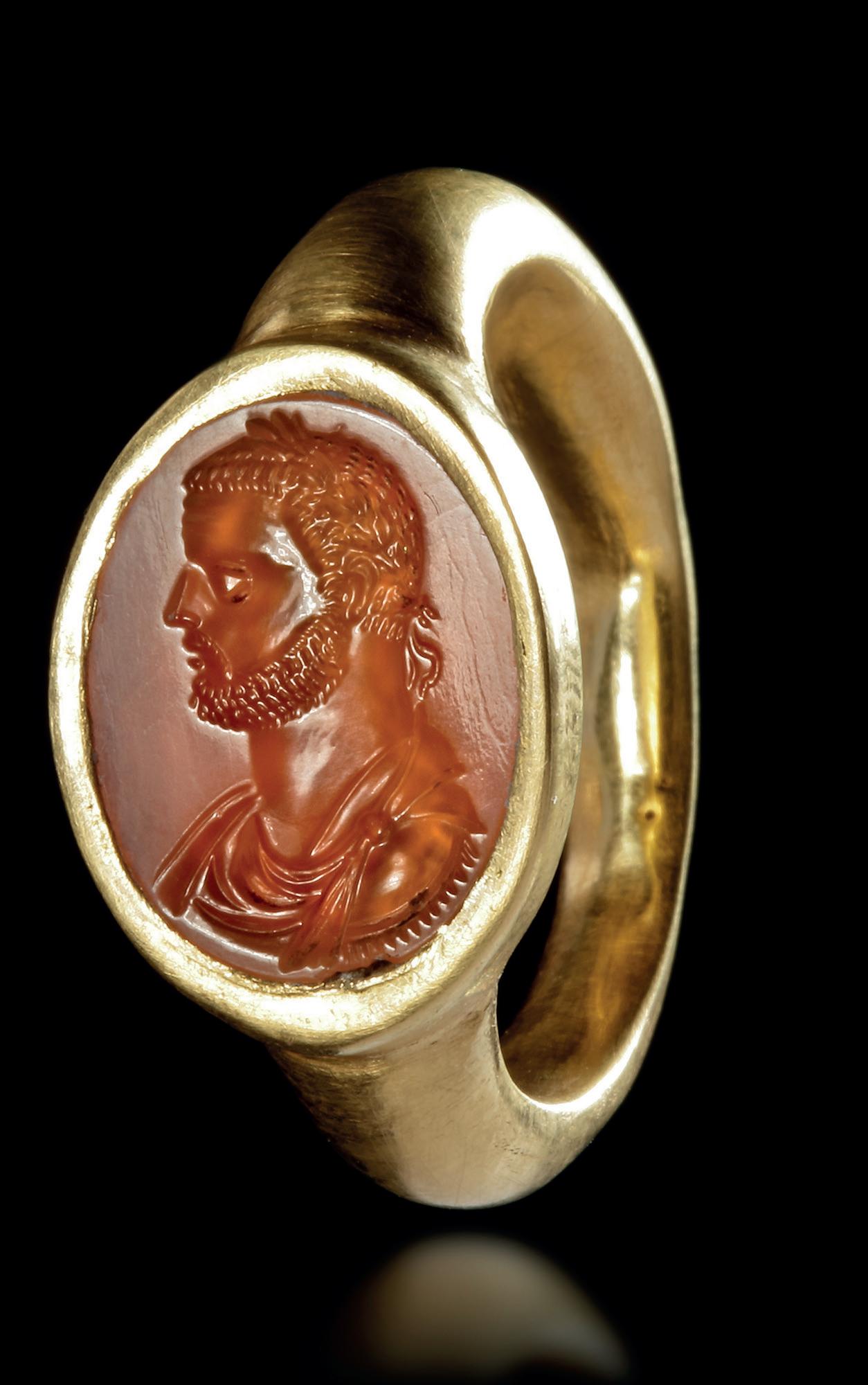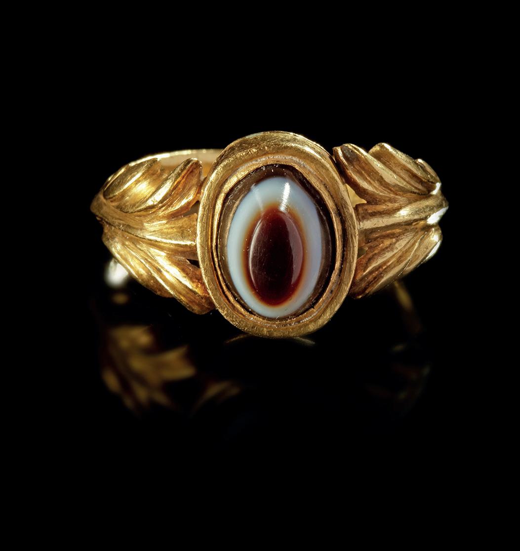 This elegant Roman ring,features a finely carved agate intaglio set within an ornate gold bezel of scalloped loops. The vivid red stone is engraved with a striking depiction of a Roman military helmet, rendered with precise detail and framed by laurel motifs symbolizing victory and honor. Worn as both personal adornment and a mark of status, the ring reflects Roman martial pride and artistic refinement.