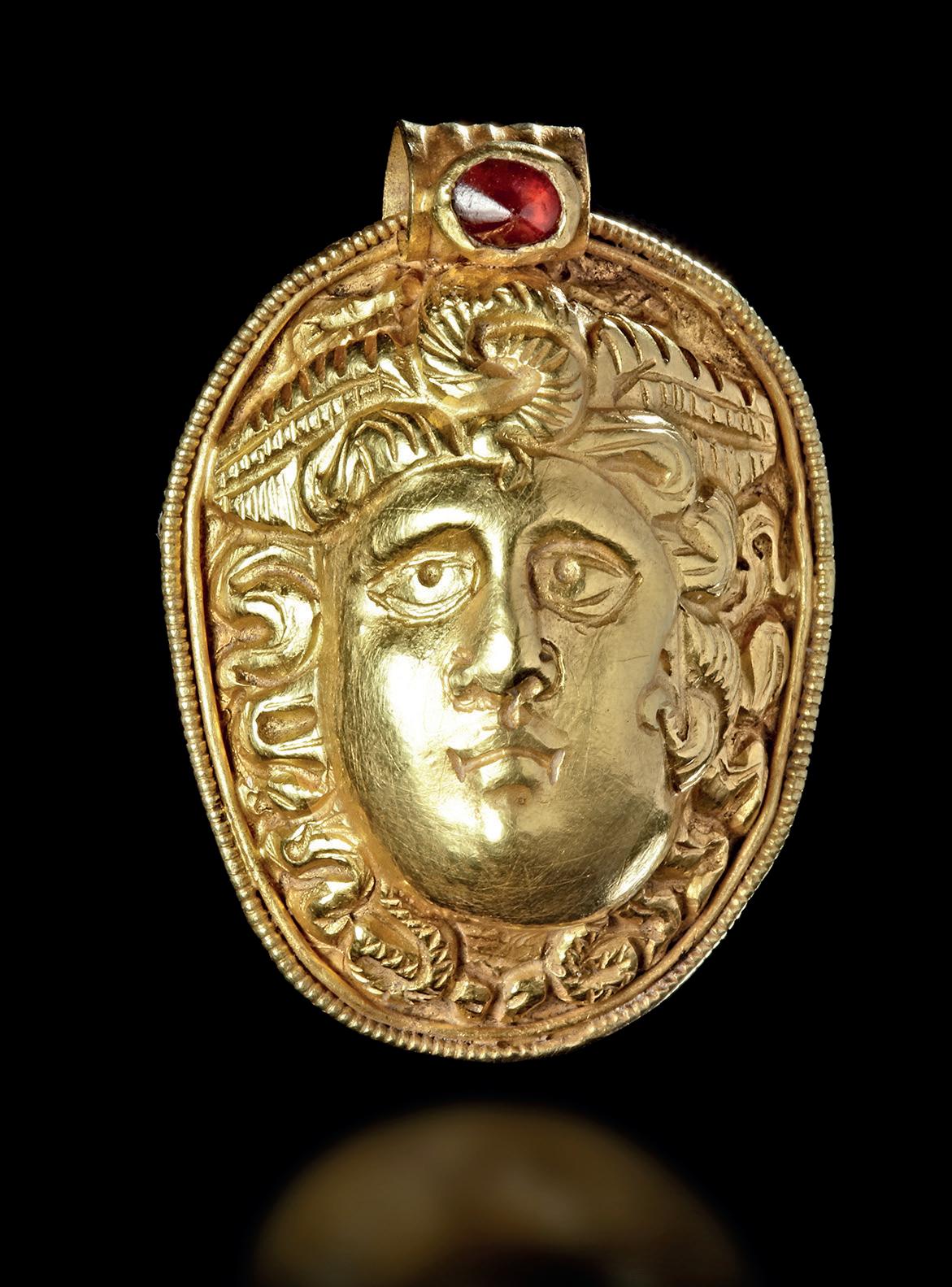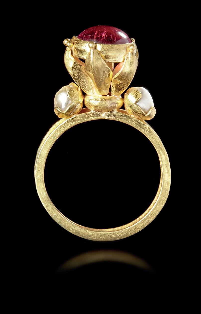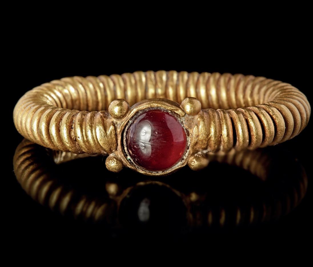A Phoenician gold ring made from a tightly coiled wire which had been soldered to keep it rigid. The shank in this case is a small circular cell holding a cabochon garnet, flanked by four gold globules. Gold and garnet. Phoenician 5/6th.c.A.D.
