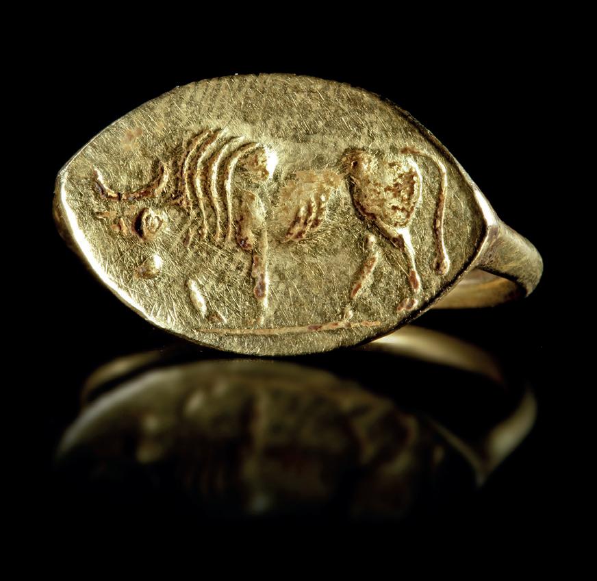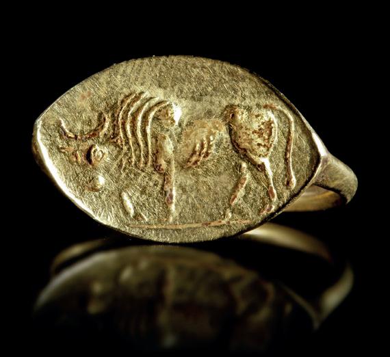 AN ARCHAIC GREEK GOLD RING WITH A BULL, CIRCA LATE 6TH CENTURY BC