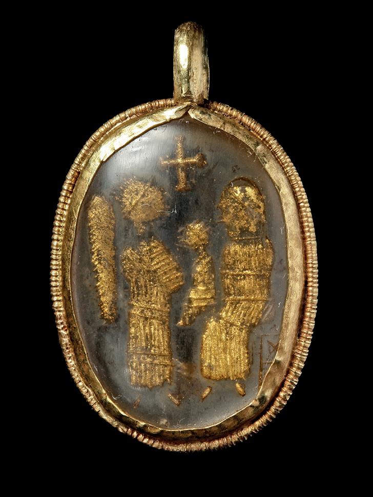 A Byzantine pendant in gold and rock crystal. The technique involved two oval cabochon rock crystal element, one of which was engraved on the flat side and then gilded with gold dust and a substance for adherence. The two halves were kept together by the gold frame which had a narrow profile in order not to obscure the type, which shows the Virgin and child with and Angel with an equal armed cross above. 35 by 24 mm.