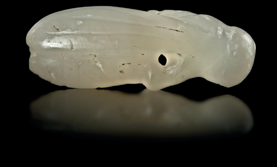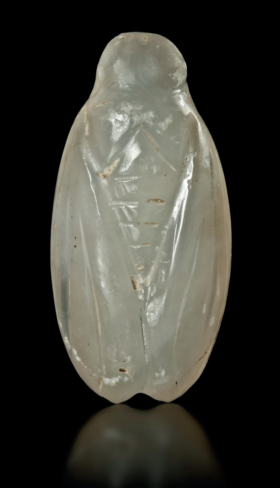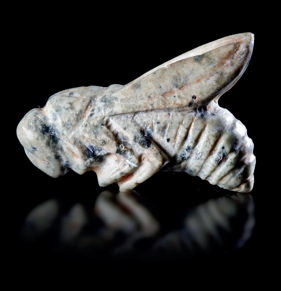 An amulet of a bee made from a variegated crystalline limestone. This finely carved amulet of a bee might well have been made for wearing as the wings close above the body allowing for a hole for suspension. The bee was a popular subject in antiquity as it represents hard work, fecundity and selflessness.