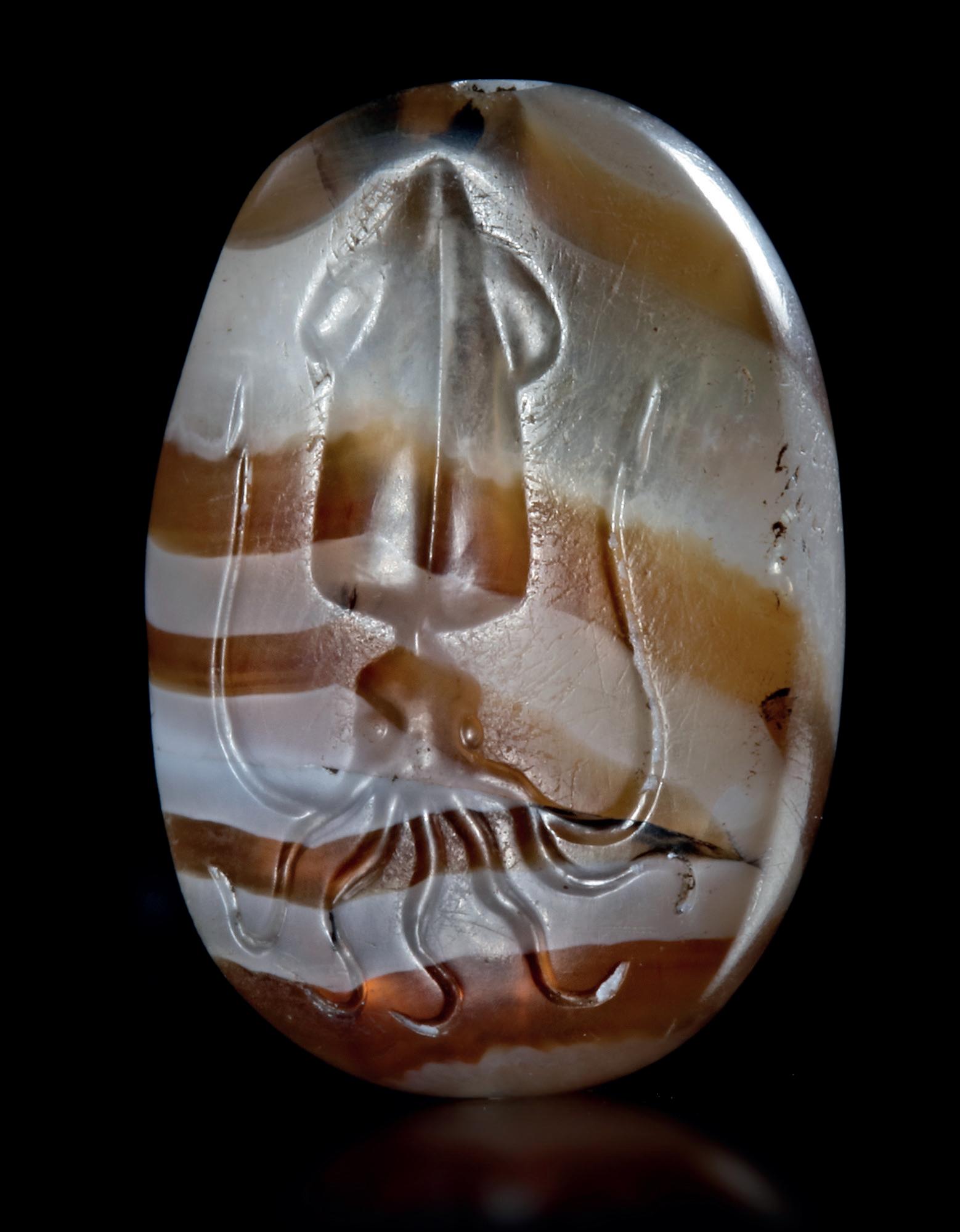 An oval Minoan stamp seal showing a cuttlefish. The seal is made of a banded agate and has a rounded back. A narrow piercing through the long axis of the stone would have been for suspension. This seal is a good example of the wondrous realism achieved by Minoan artists when observing nature.