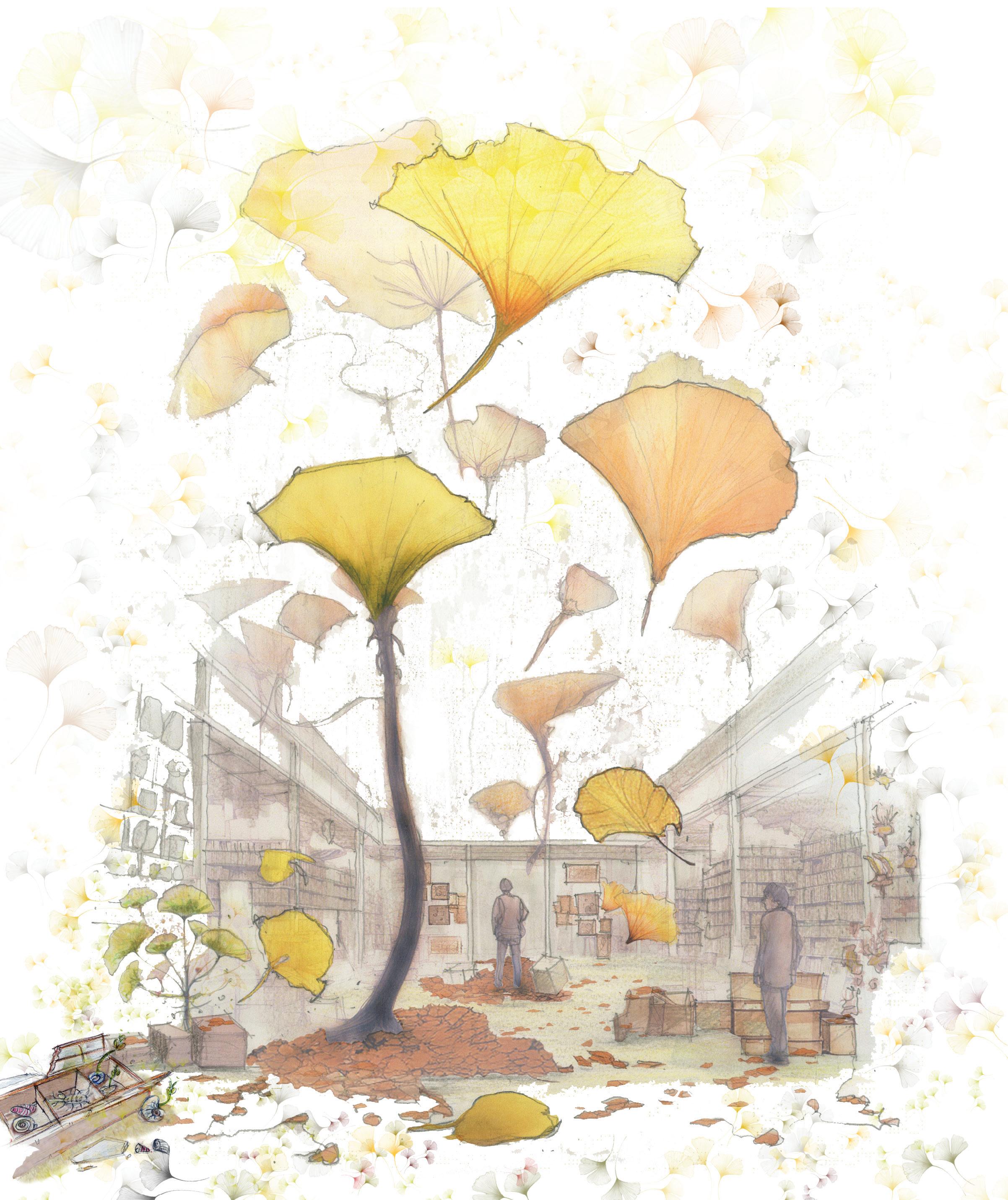 to traditional taxonomic boundaries. It is a “living fossil” that has remained relatively unchanged for 200 million years and is the only living species in the genus. This raises questions about how we classify species that occupy unique evolutionary niches. To celebrate the ginkgo tree and enhance the sensory stimuli of the forecourt, Ginkgonomy places them in misty planting beds and combines them with artificial elements, such as imbricated super-leaves, wind chimes, and wind spinners inspired by the shapes of ginkgo leaves.