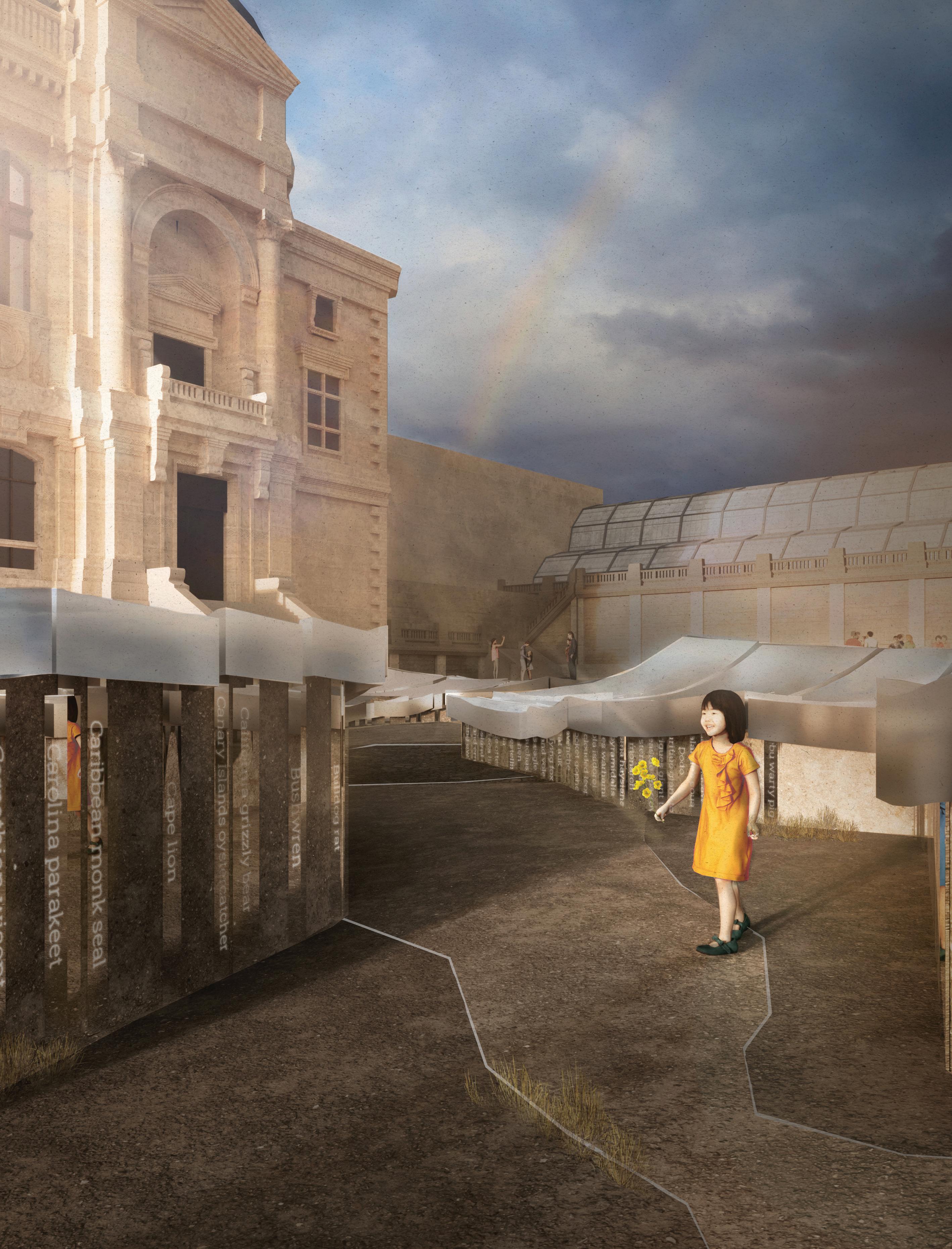 The terrain fractures, unveiling a profound pathway at its core. Visitors wander through the terrain, contemplating these extinct species as if unearthing paleontological remains. Additionally, this design introduces a new entrance to the existing museum.