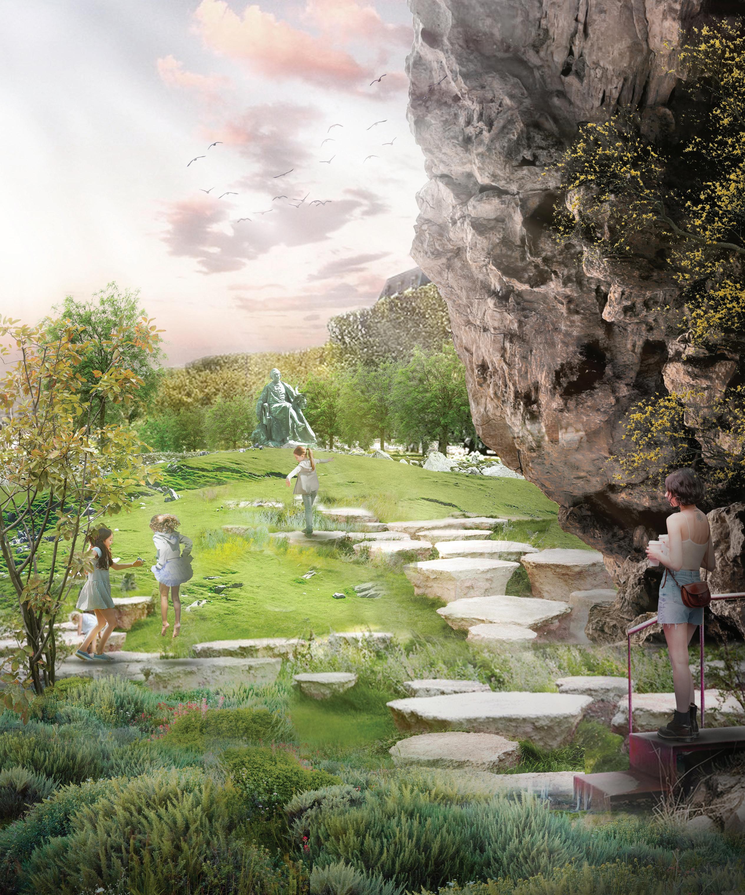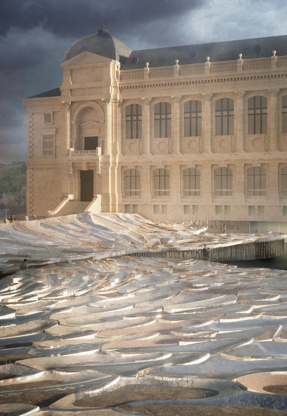 historical climate. This serves both as a nod to the native ecosystems that were once in this area and as a pioneering effort to address the potential geological calamity of sinkholes in the limestone geology of Paris—a city that, because of the extensive former quarrying operations, is sometimes said to be “built on air.” As Paris gets drier and hotter, the cooler microclimate of this sunken garden offers a sanctuary for the public and provides a flexible approach to extreme weather by accommodating changes in water levels from rainfall. The museum’s forecourt will evolve from a colonial-era relic to a dynamic educational space. Where human influence once reigned, the power of nature and evolution now takes center stage.