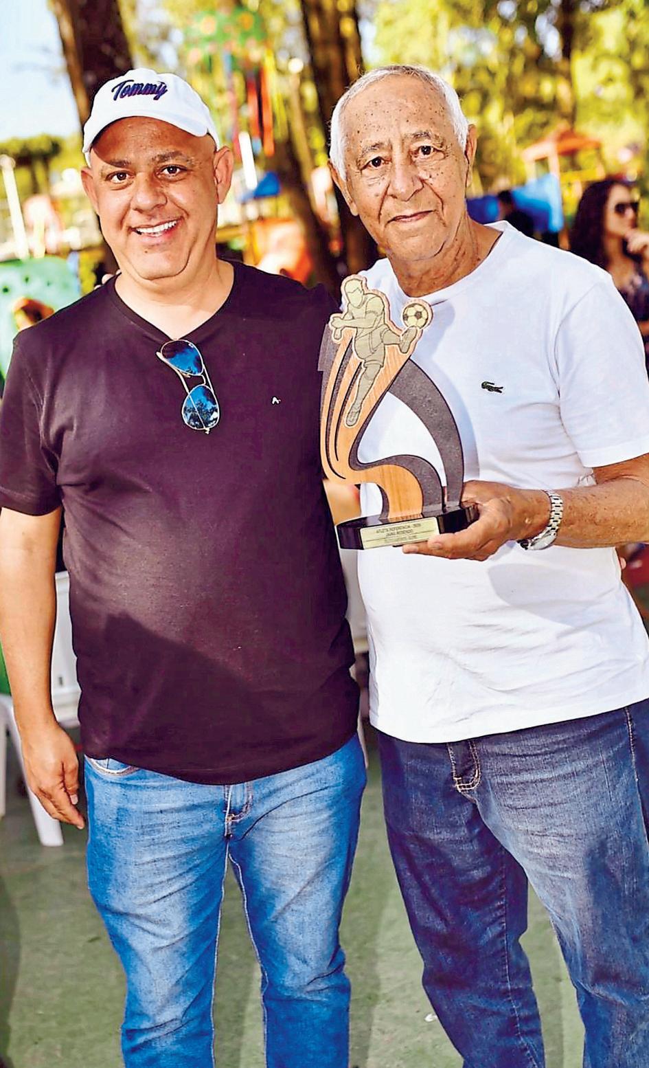 J Reconhecimento. O senhor Jairo Rosendo Franca foi homenageado na final do campeonato do Teuto. Na foto, ele com o filho Alisson Rosendo.