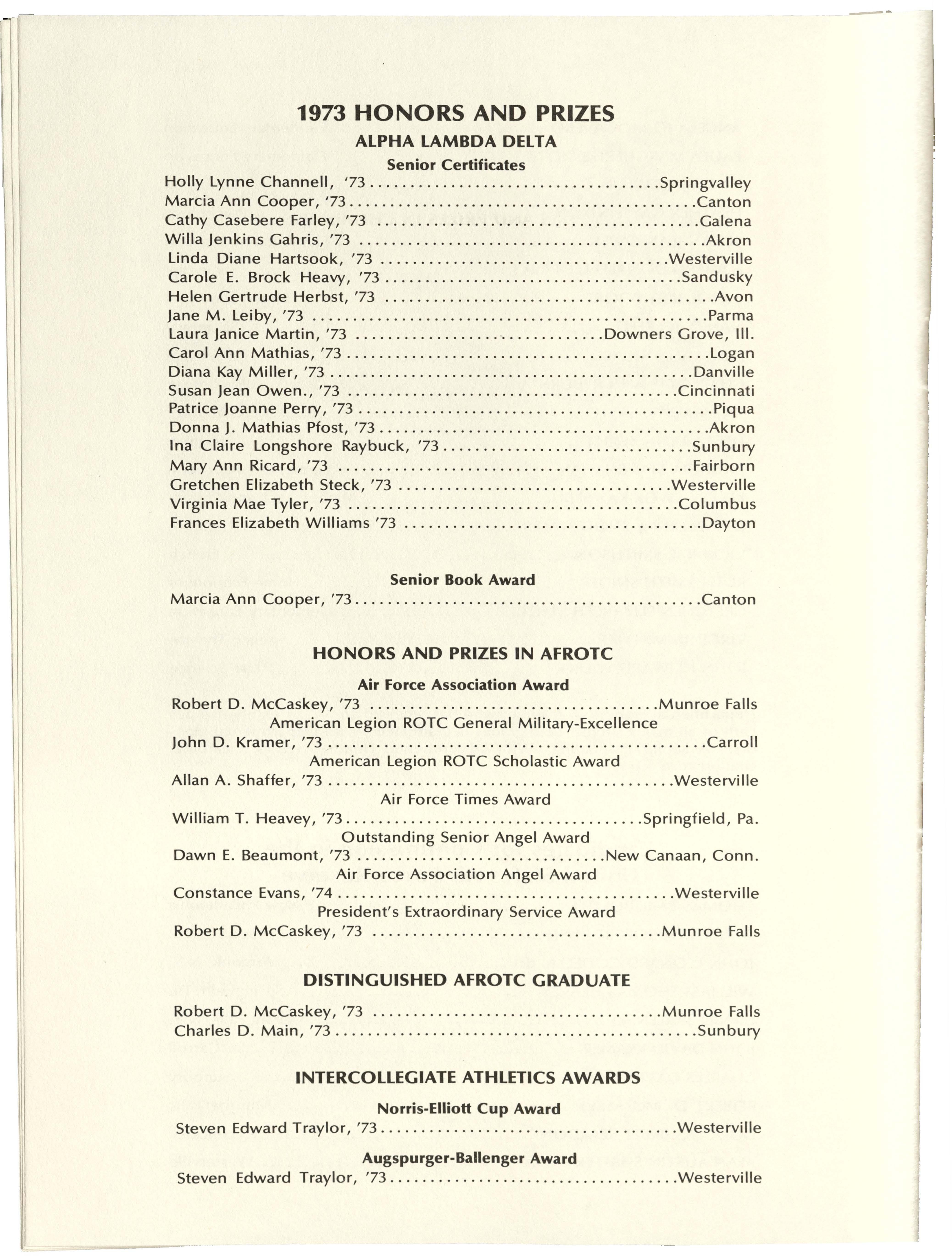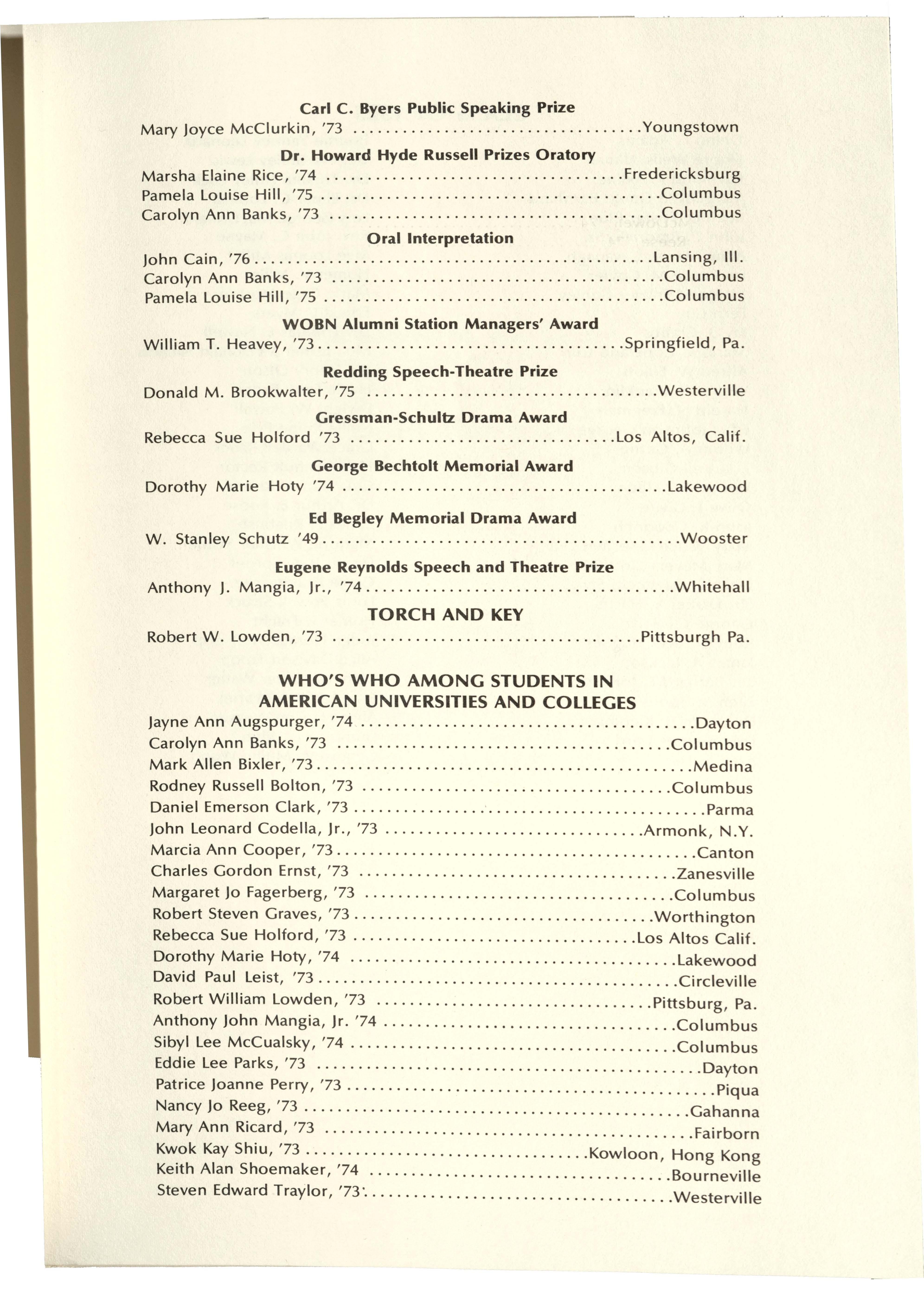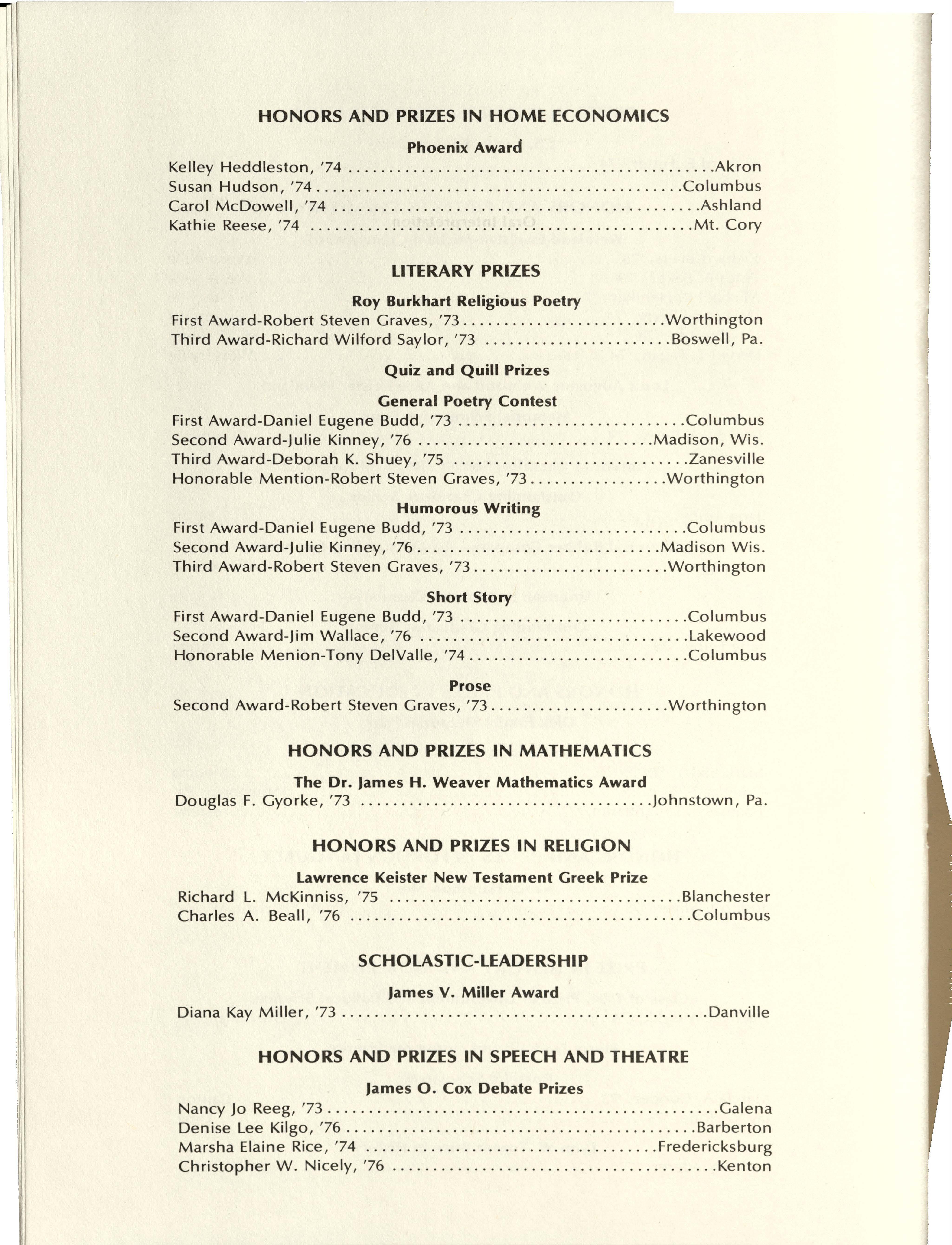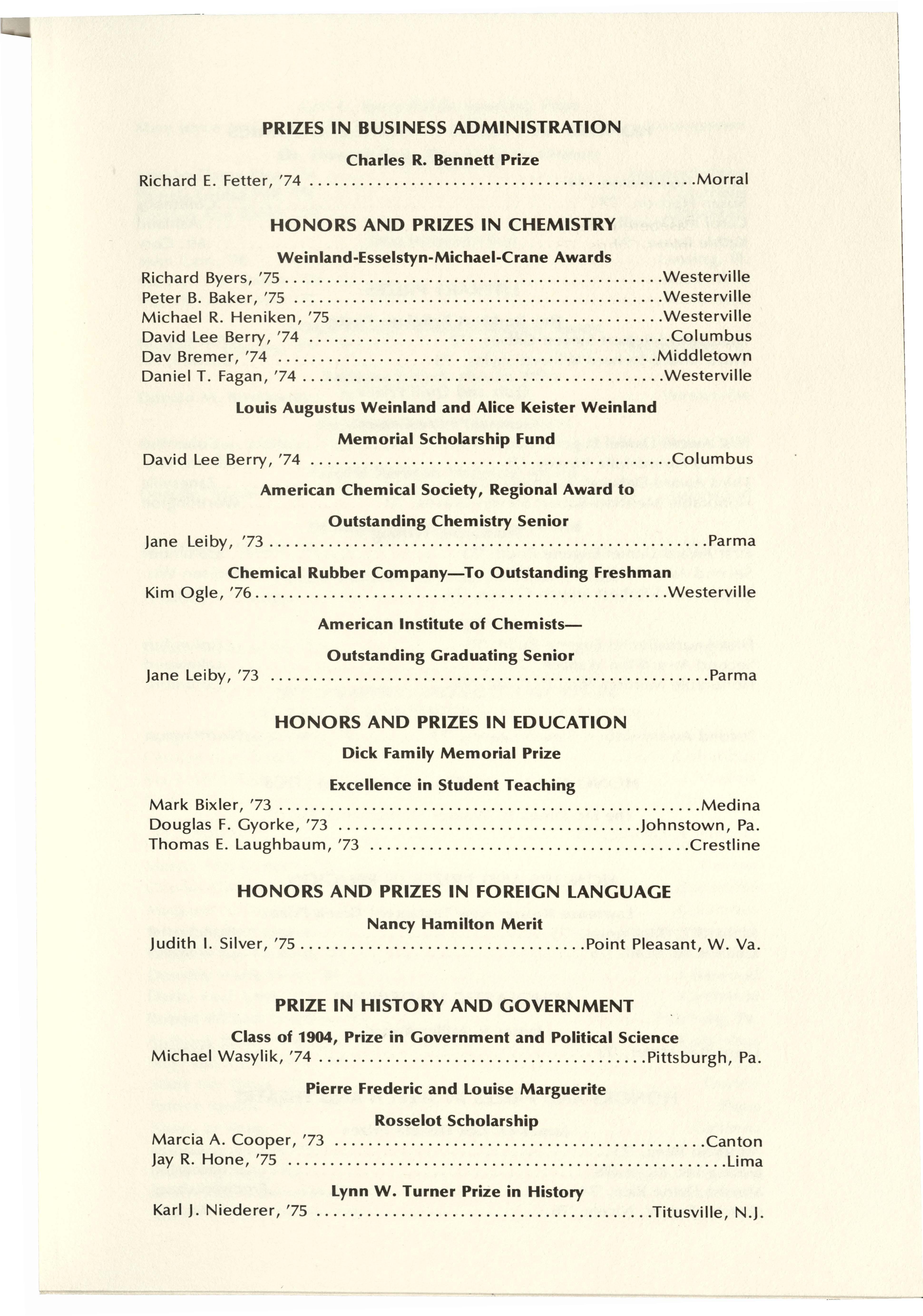 He has been successful in stimulating other writers by listening sympathetically to their problems and by offering suggestions. To encourage faculty authors, he helped found The Otterbein Miscellany Interested in local authors, he and his wife in recent years have edited annually a bibliography with comments called "Some Westerville Writers." He also contributed a series of articles to Public Opinion on literary traditions in the community called "Westerville Writers. " He is active in the Westerville Historical Society and is the Society 's archivist.