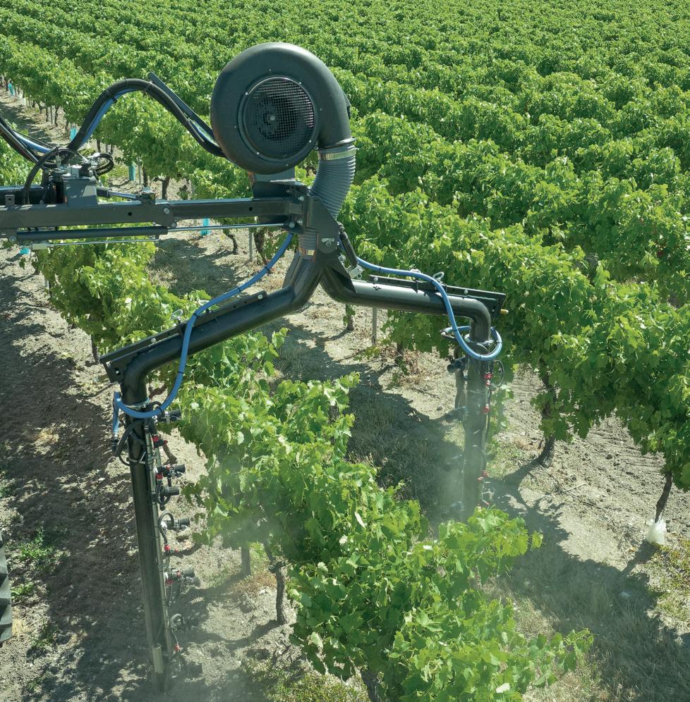 • Con las bajantes dobles PELLENC, la separación entre los difusores y el colchón vegetal se puede ajustar para asegurar una calidad de aplicación perfecta, independientemente de la anchura de la planta y del espesor de la vegetación.