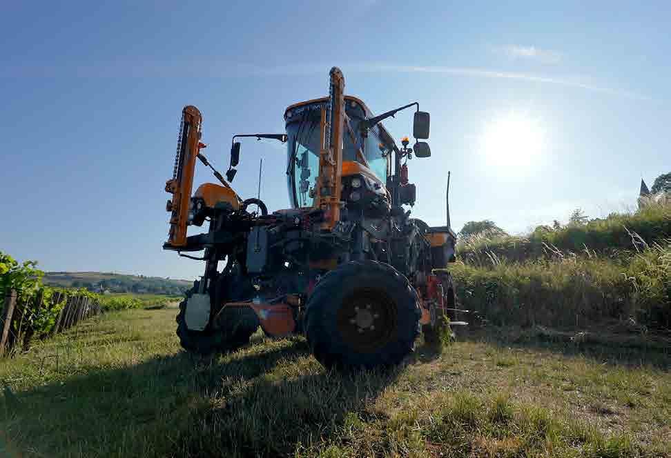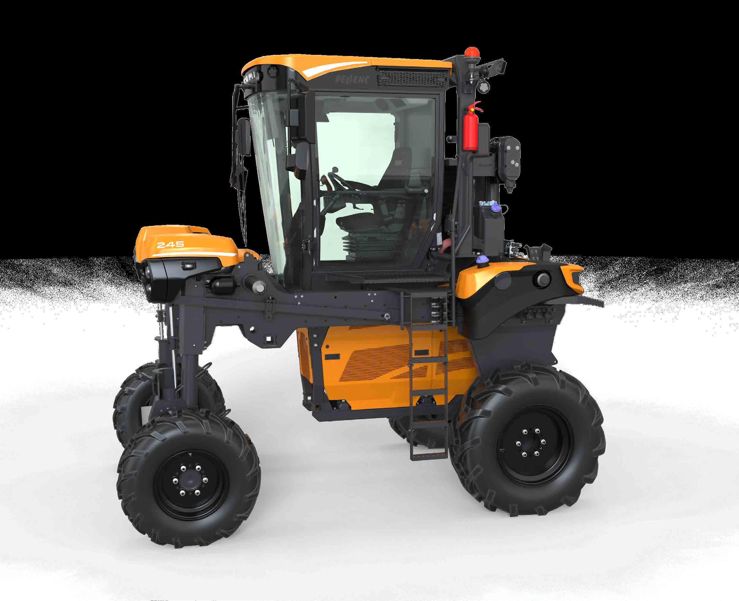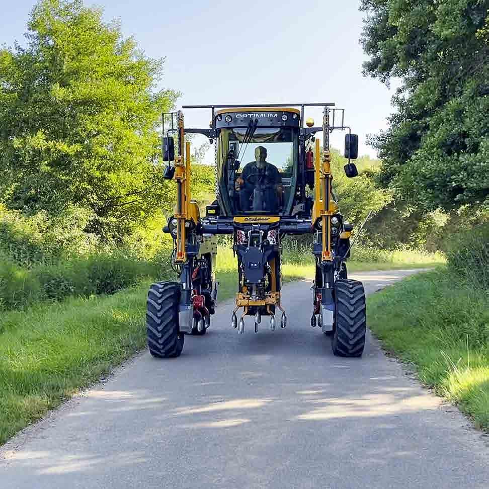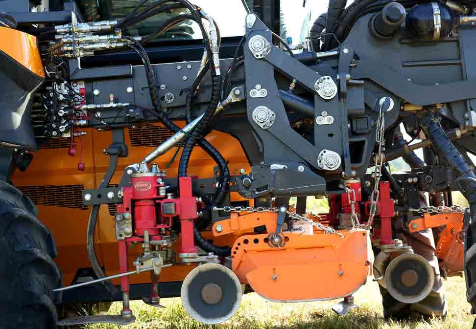 offre un pilotage souple et précis. Grâce à son empattement court, sa voie variable hydraulique et sa capacité à travailler en double ou triple rang, il s’adapte à tous les profils de parcelles, même les plus pentues.