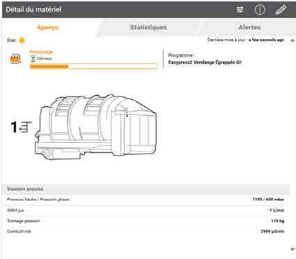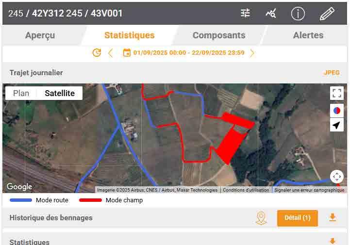 Vous pouvez anticiper l’entretien et les révisions pour garantir une productivité maximale tout au long de l’année, particulièrement pendant la récolte. Le suivi du travail en période intensive est également simplifié grâce à l’accès en temps réel aux réglages de la machine et au suivi du travail effectué, etc. Lorsque le travail est terminé, les statistiques telles que le nombre d’heures, la consommation de carburant ou le débit de chantier sont disponibles depuis l’onglet dédié sur la plateforme PELLENC CONNECT.