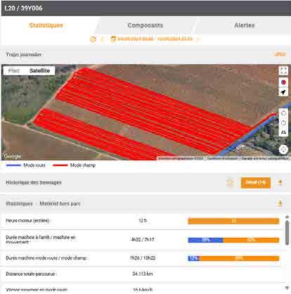 Avec l’option télémétrie sur OPTIMUM 245, suivez votre parc matériel en temps réel grâce aux données récupérées sur l’enjambeur et l’outil attelé. Visualisez à distance sur tablette, PC ou smartphone :