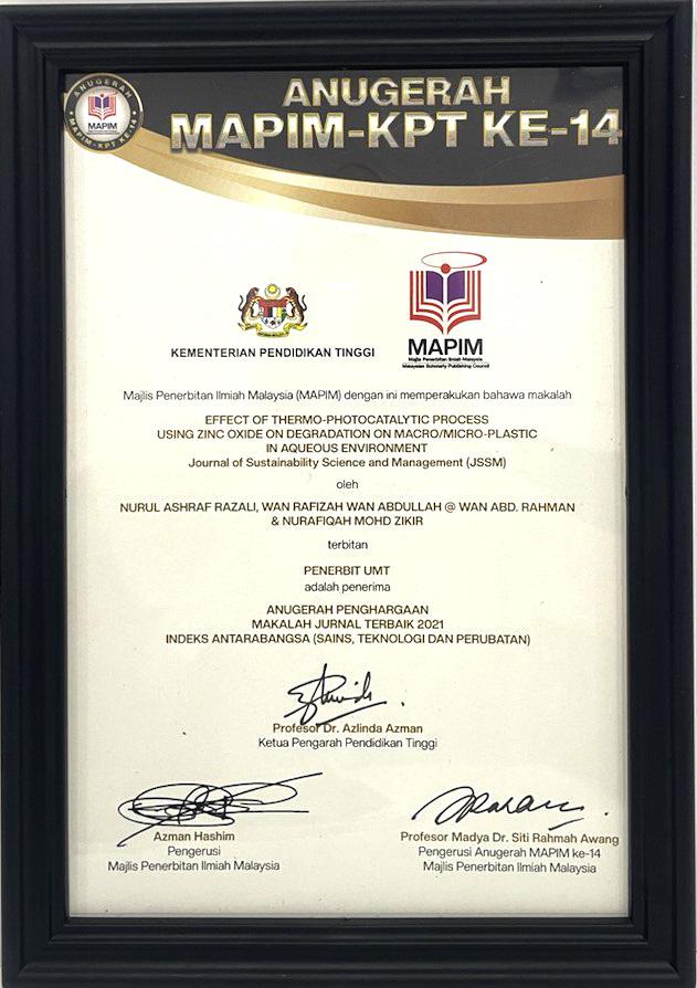 Selain itu, makalah dari Journal of Sustainability Science and Management (JSSM) terbitan Penerbit UMT berjudul; Effect of Thermo-Photocatalytic Process Using Zinc Oxide on Degradation on Micro/Micro-Plastic in Aqueous Environment tulisan Dr. Nurul Ashraf