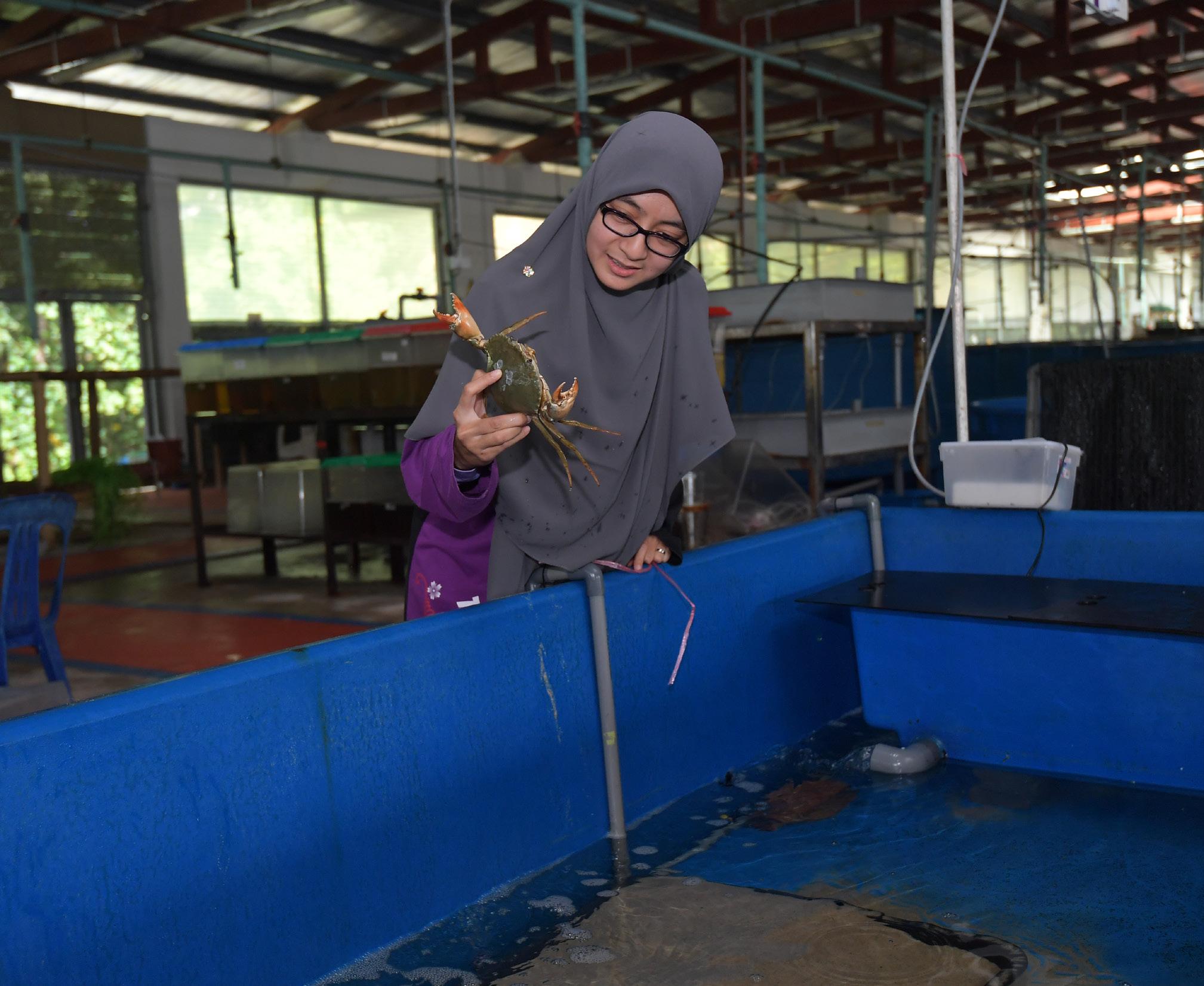 Dr. Aaqillah releasing crabs into the tank at AKUATROP Hatchery