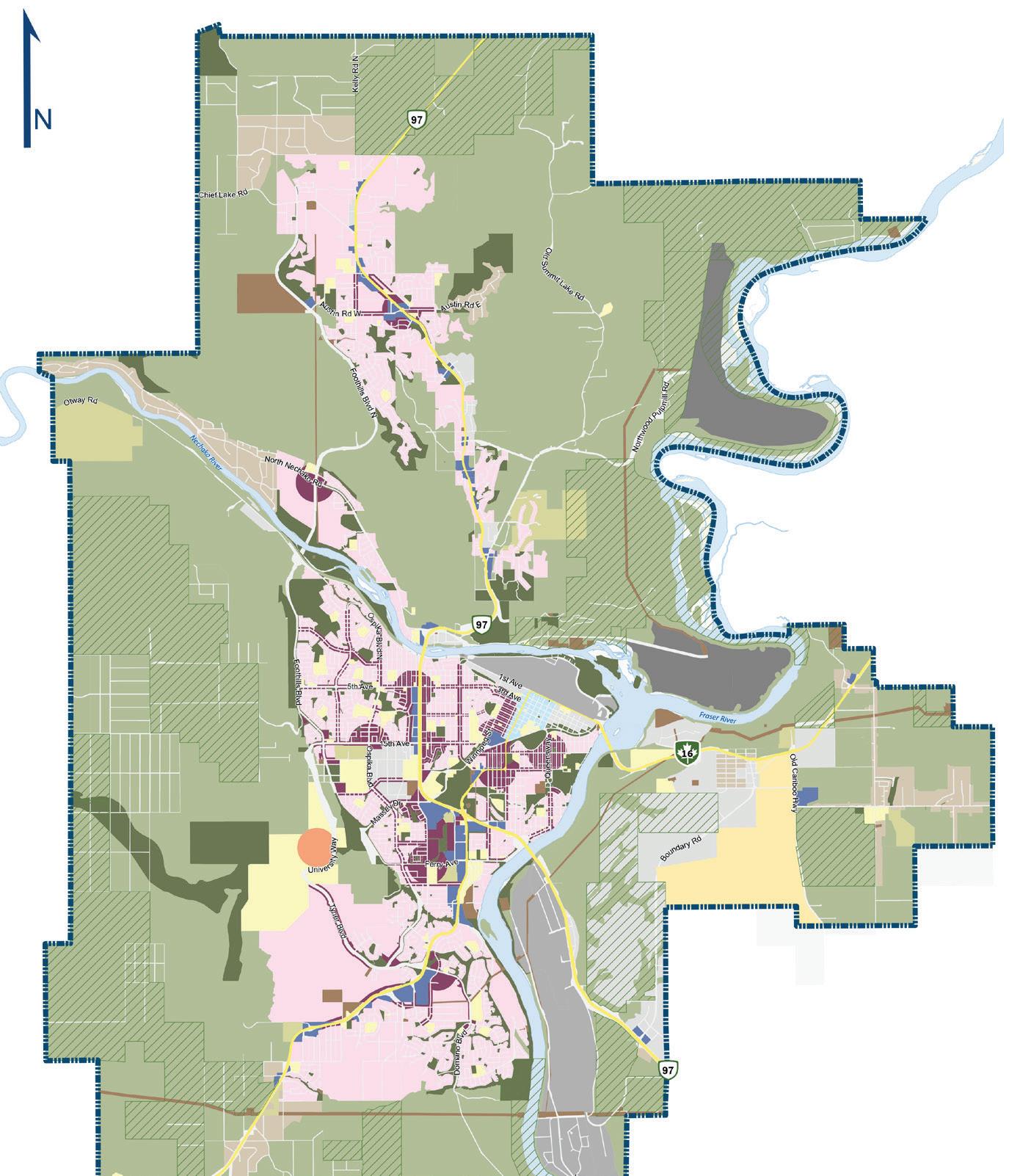 Light, medium and heavy industrial land uses are largely limited of the more densely populated areas of the city, like the BCR Site, along Boundary Road and near the airport, and along the Fraser and Nechako rivers north of where they merge near Cottonwood Island Park.