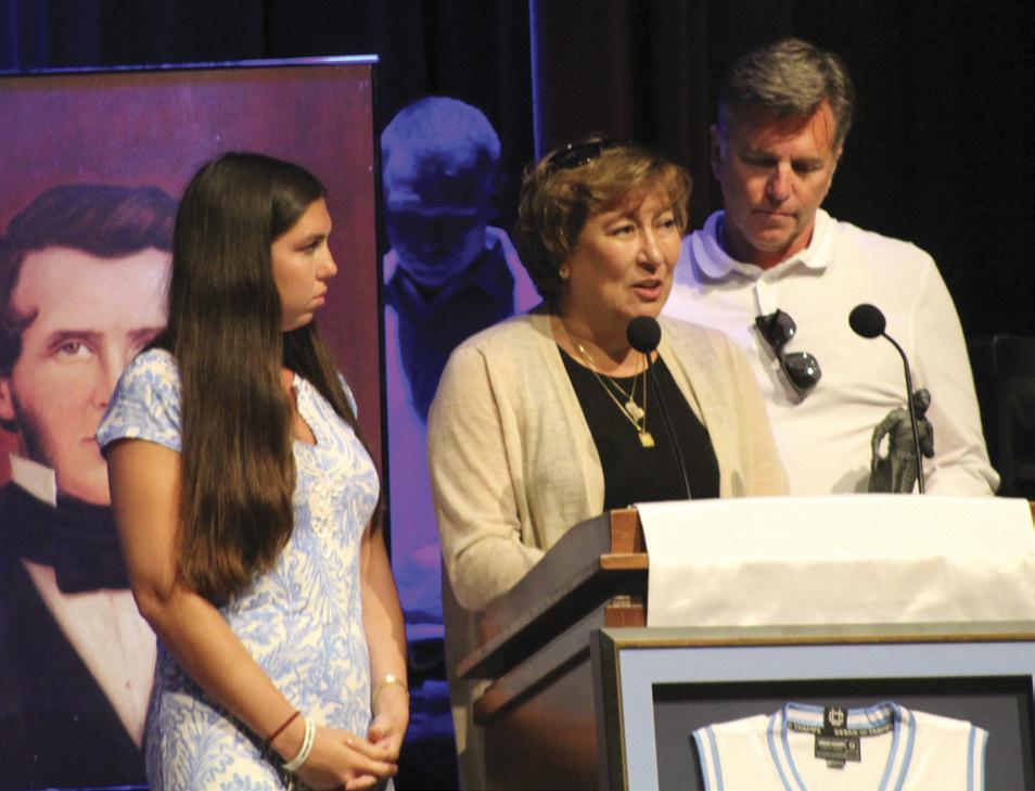 Alongside Brian’s mom, Mary, dad, Sean, and sister, Micaela, Foundation President Sean Wagner presents the first Brian Fraser Presidential Memorial Scholarship to Matt Quick.
