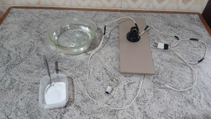 Umalâmpada,umsoquete,umpluguedetomada,fiosdeluzpresosemumpedaçode madeira,sal,vasilha,água.
