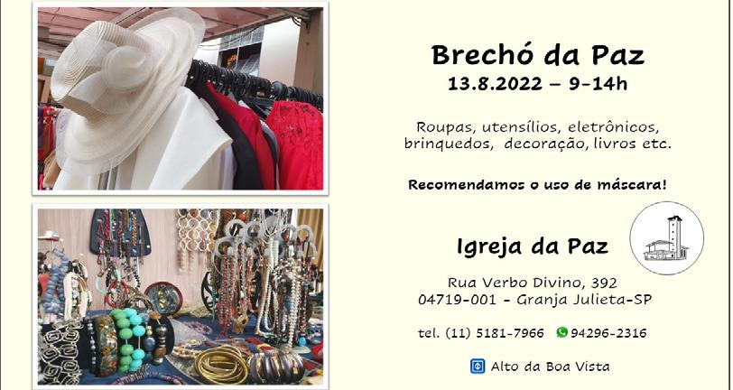 INFOPAZ: Publicação mensal da Paróquia de Santo Amaro, Sínodo Sudeste da Igreja Evangélica de Confissão Luterana no Brasil (IECLB) Igreja da Paz: R. Verbo Divino, 392 - Granja Julieta - CEP 04719-001 - São Paulo/SP - TEL: (11) 5181-7966 ou (11) 5183-2795 / www.igrejaluteranadapaz.com.br / www.luteranos.com.br/santoamaro TEL.PASTORES: P. Hermann: (11) 99166-1924 / P. Roberto: (11) 98300-5344 / P.Daniel: (11) 97777-0015 fb.com/LuteranaIgrejadaPazSantoAmaro / email: igrejadapaz@uol.com.br Kontakt auf Deutsch: Pastor Daniel - pastordaniel@posteo.org / Handy: (11) 97777-0015