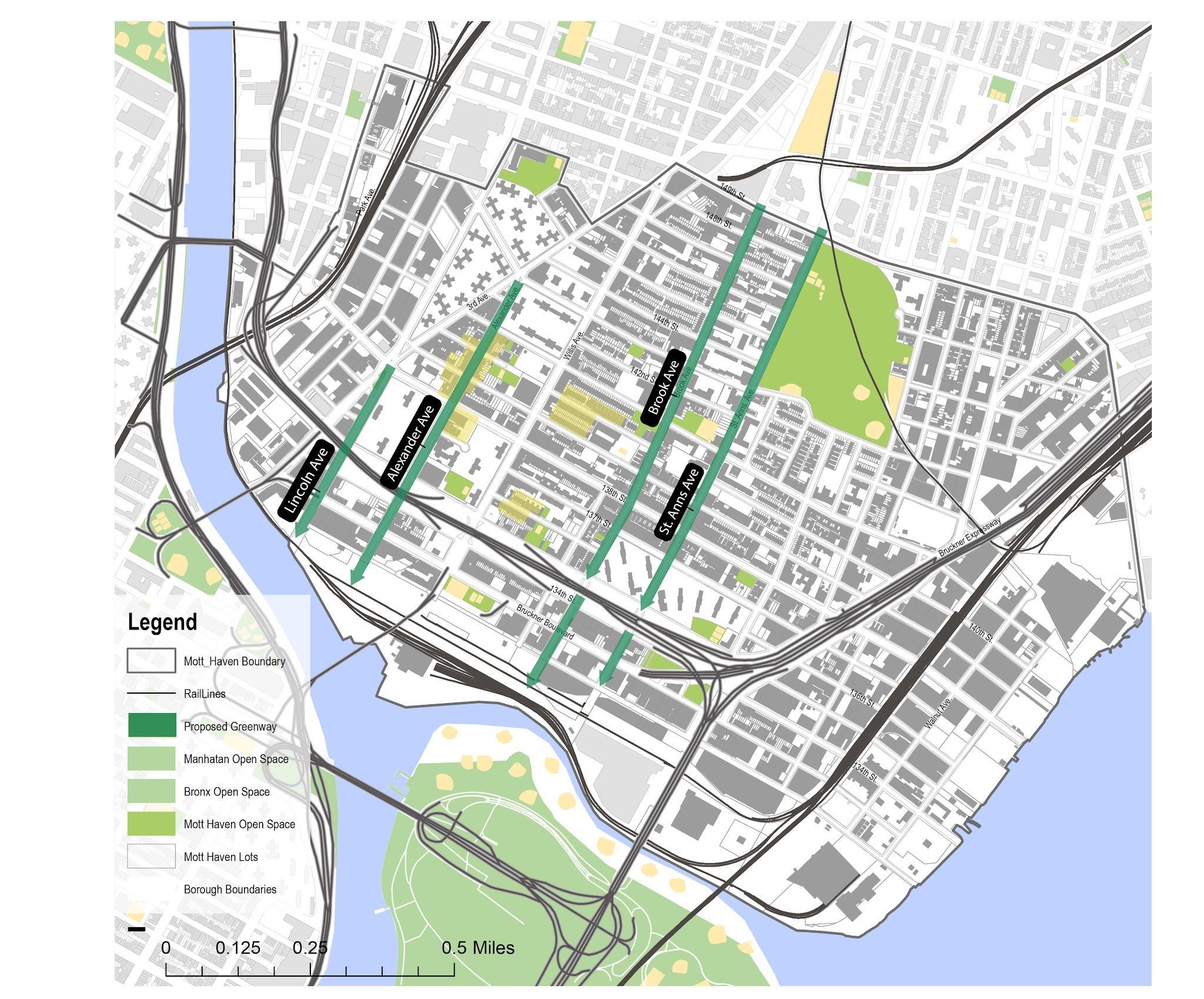 “ Design interventions along Lincoln, Alexander, St. Ann’s, and Brooks’ avenues are will draw residents from Mott Haven’s neighborhood “core.” If implemented, the changes on these streets, each of which connect directly to the waterfront, will form a cohesive network of connectivity throughout Mott Haven.”
