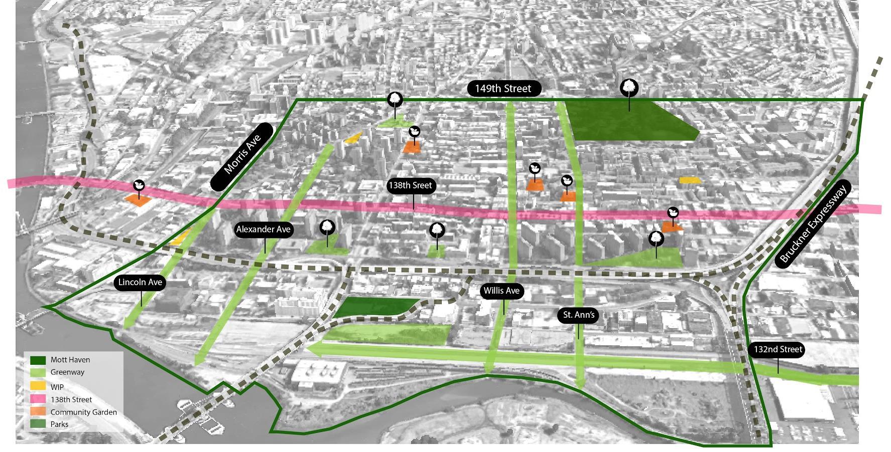 Map identifies potential corridors for landscape transformation, which will act as main axes connecting the Mott Haven core to the Waterfront.//