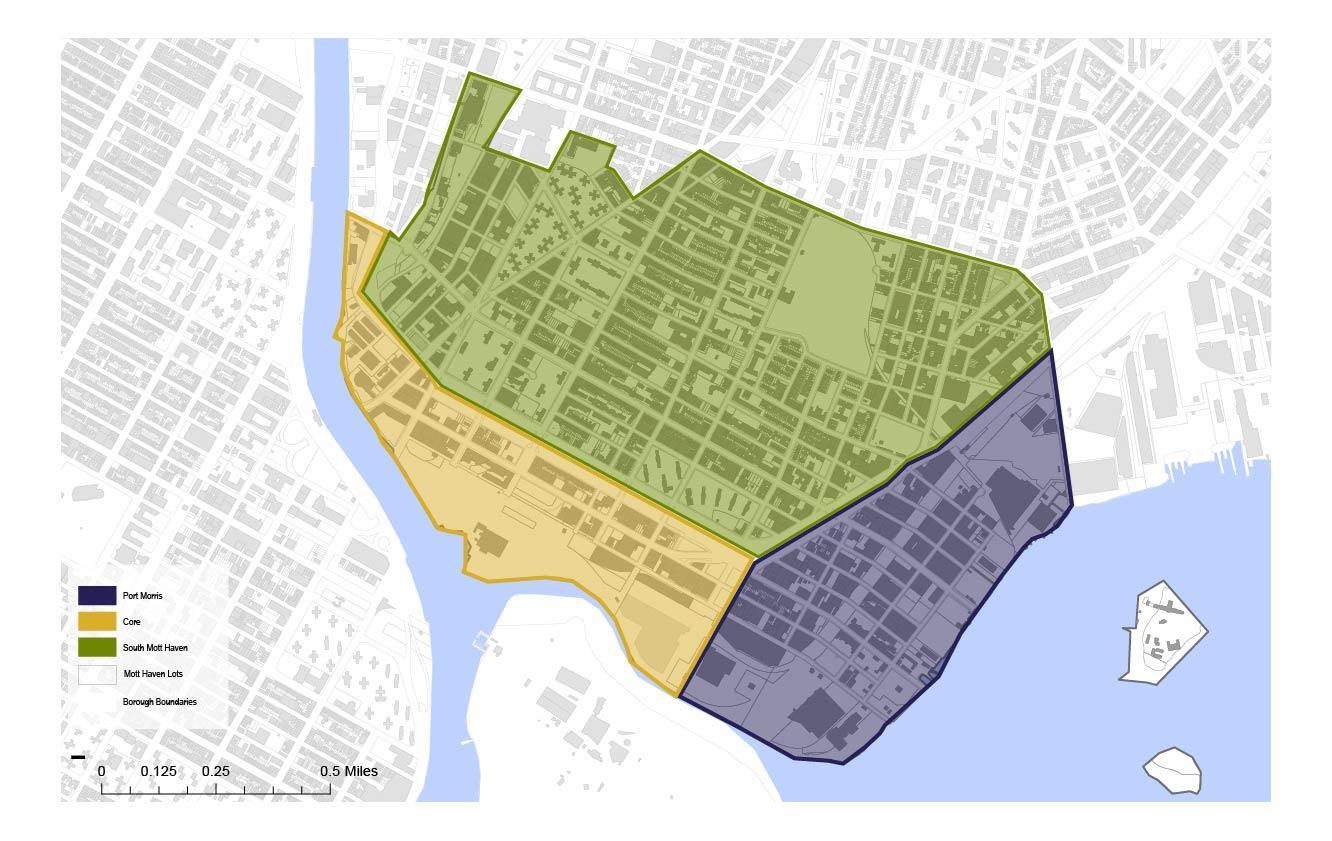 Mott Haven is located on the southernmost edge of the Bronx in New York City, bordering the Harlem River waterfront. This research defined the study area as encompassing both Mott Haven and its neighboring industrial district to the east, Port Morris. The East River serves as the study area’s eastern boundary, while the northern boundary falls on 149th Street, extending from one waterfront to the other.